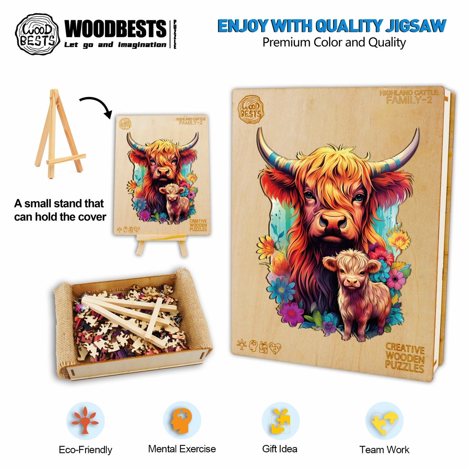 WOODBESTS Wooden Puzzle for Adults, Highland Cattle Family Puzzle (M, 170pcs, 9.2"x11.4") Beautiful Wooden Box, Wooden Jigsaw Puzzles Unique Shape, Birthday Gifts for Adults and Kids Family Game