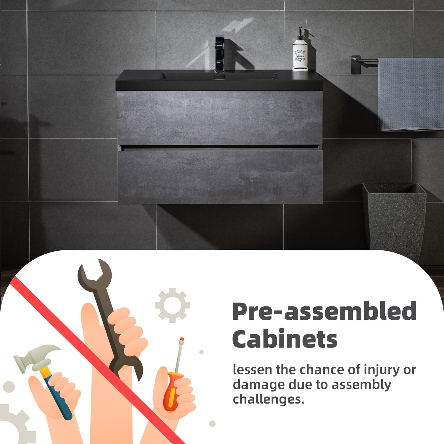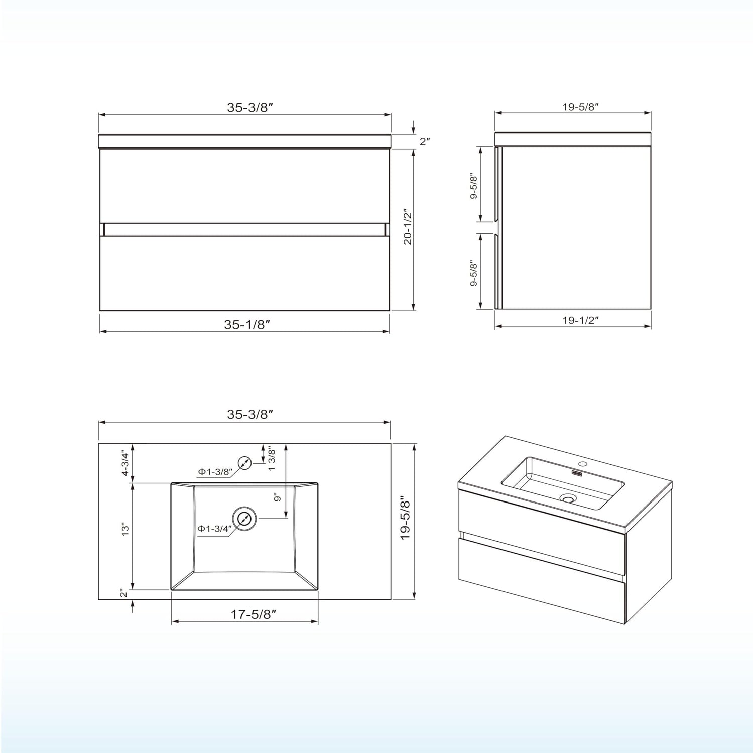 - ✅ [SPACE-SAVING DESIGN]: With dimensions of 35-3/8" W x 19-5/8" D x 22-1/2" H, this floating vanity optimizes storage in your bathroom and powder room. By mounting on the wall, it frees up valuable floor space, creating a more open and spacious atmosphere.