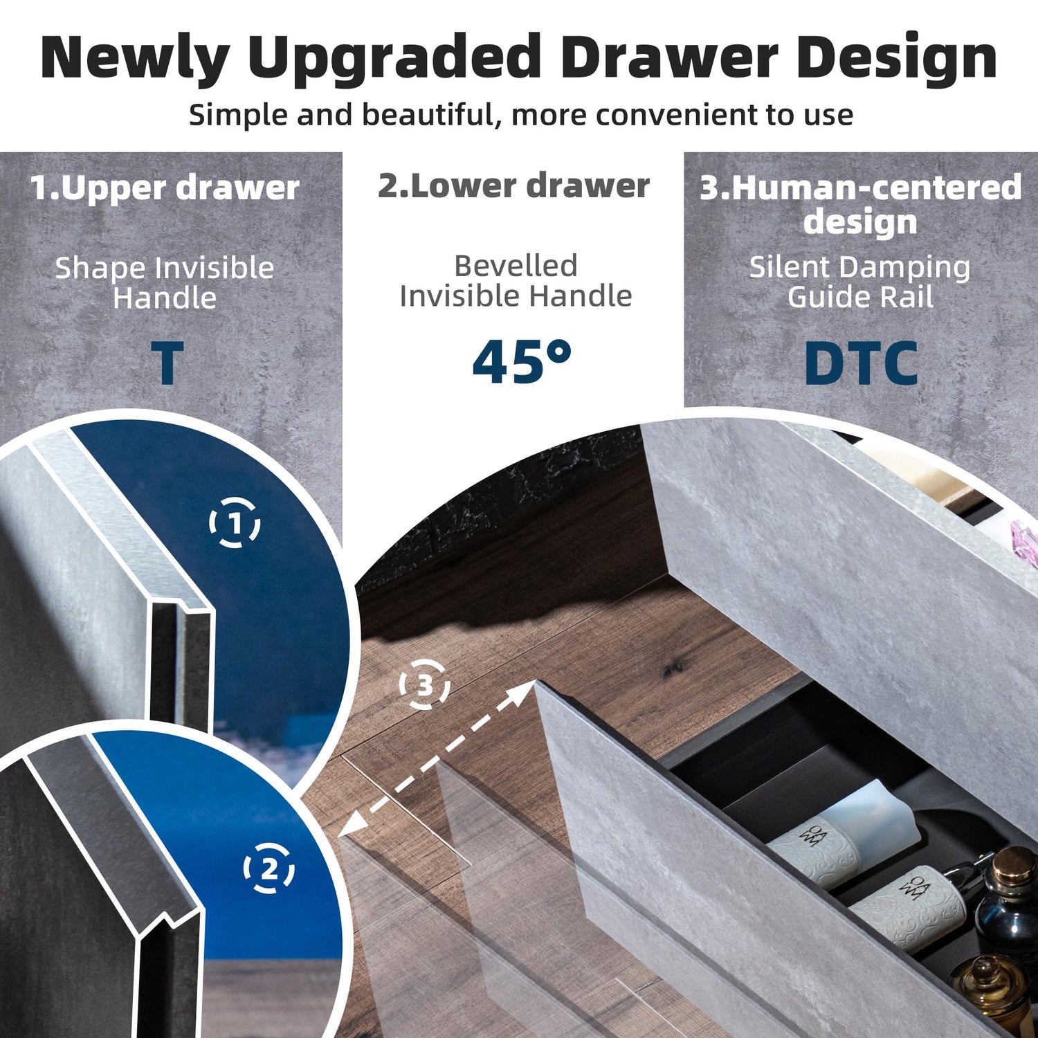 - ✅ [QUIET & SLEEK DRAWER DESIGN]: Enjoy the convenience of the soft-closing drawer slides for a quiet, slam-free operation. Both drawers feature 45° beveled invisible handles, providing a sleek and ergonomic design that fits perfectly to your fingers.