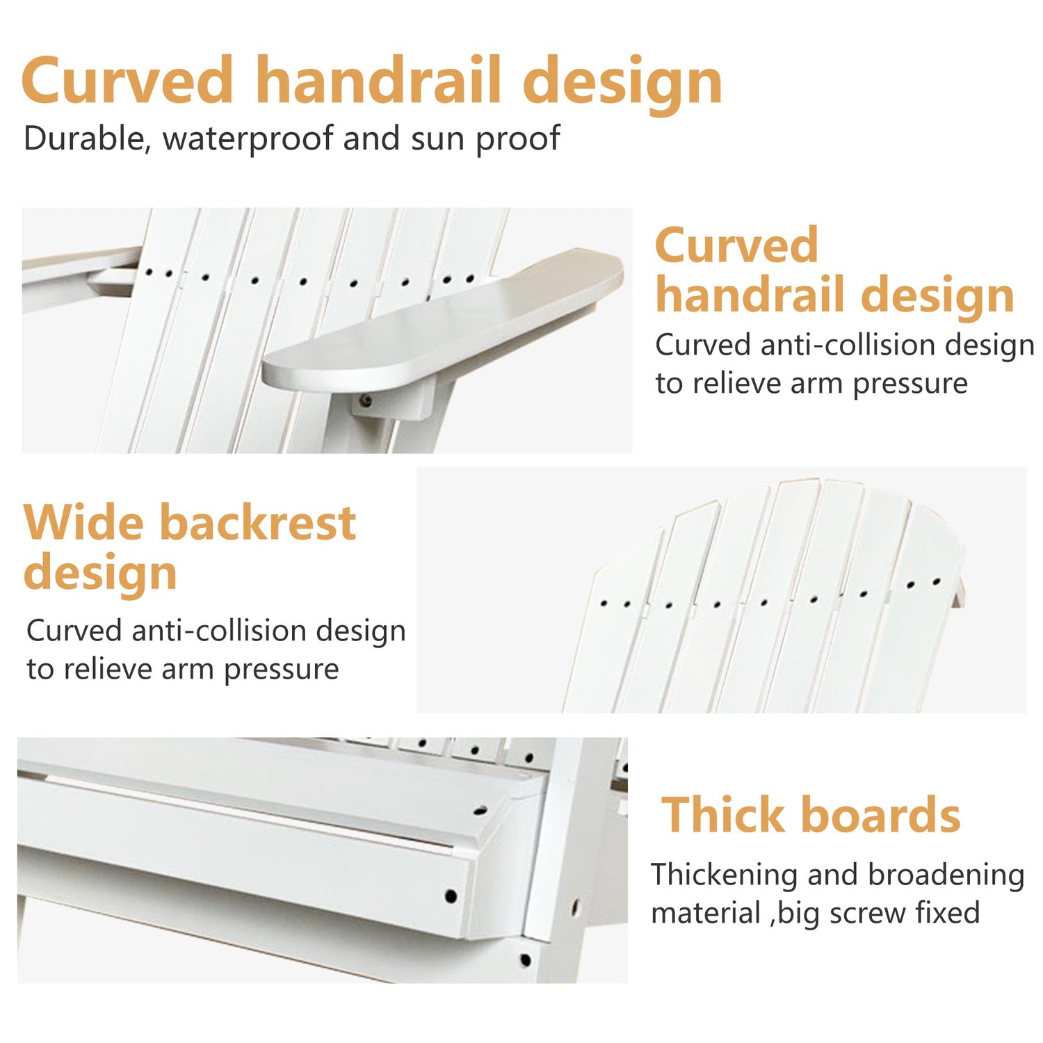- Weather Resistant: Our Adirondack chair is designed to withstand the elements. It's all-weather resistant, making it suitable for use in rain, sun, or snow. No need to worry about damage from exposure to the outdoor elements, ensuring long-lasting enjoyment.