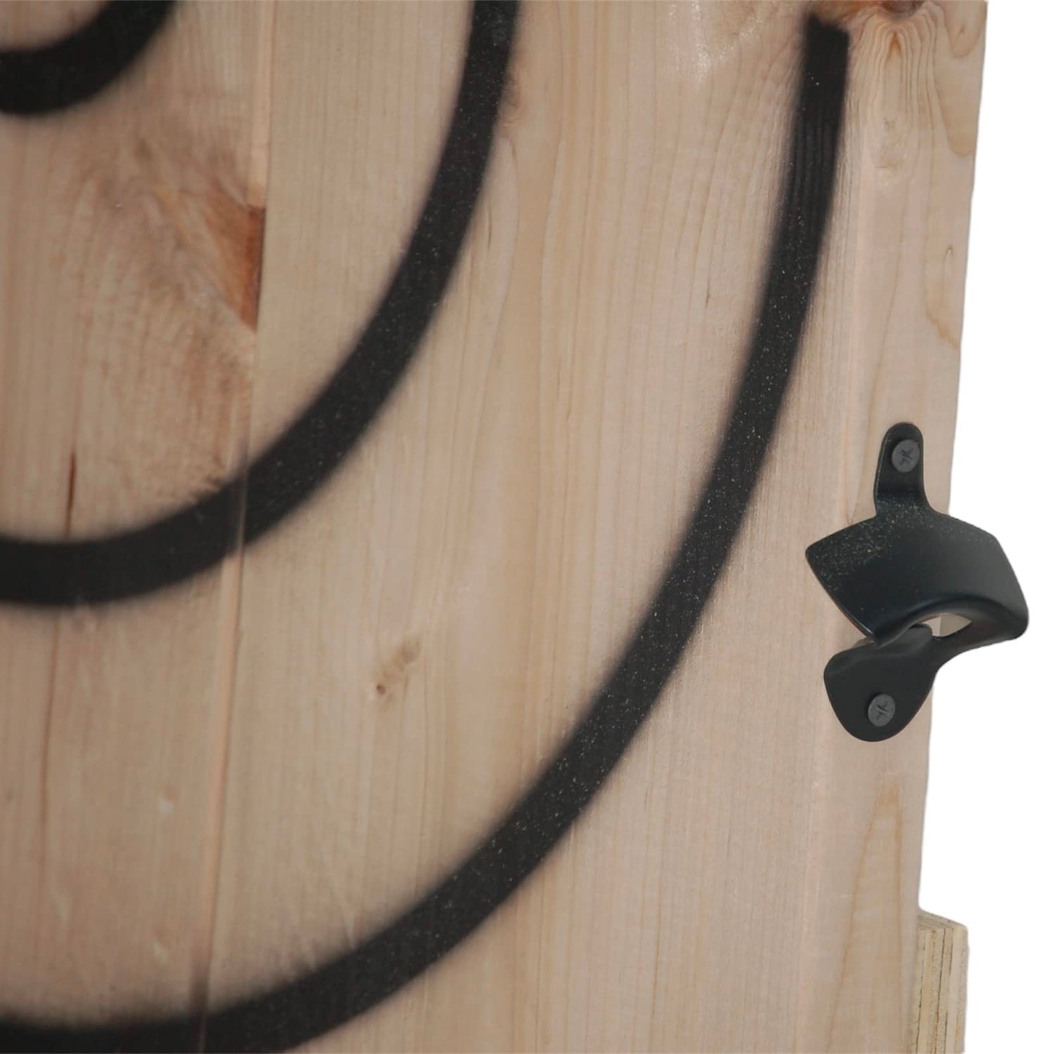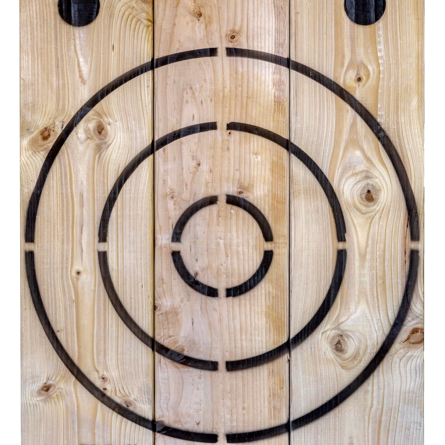 Details: Join the craze with this fun Wooden Axe Throwing Target. Compatible with Axe, Hatchet, Tomahawk, Knife, and Star. Official target size is great practice at home for leagues or just to have fun. Hardware included to hang. Backed by high strength cabinet grade 3/4 plywood capable of handling razor sharp blades. Measures: 35.5x27.5. Wet Target for best results to stick in fresh wood. Axes are not included.