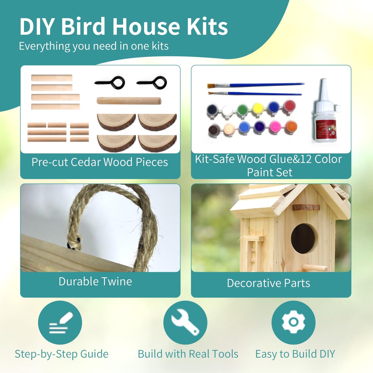 - 【Complete Crafting Kit】11 cedar wood pieces, 4 cedar shingles, 2 nails, wood glue, 2 eye hooks, 1 perch, 2 brushes, 1 box of 12 color paintseasy-to-follow instructions for seamless crafting. Hammer not included.