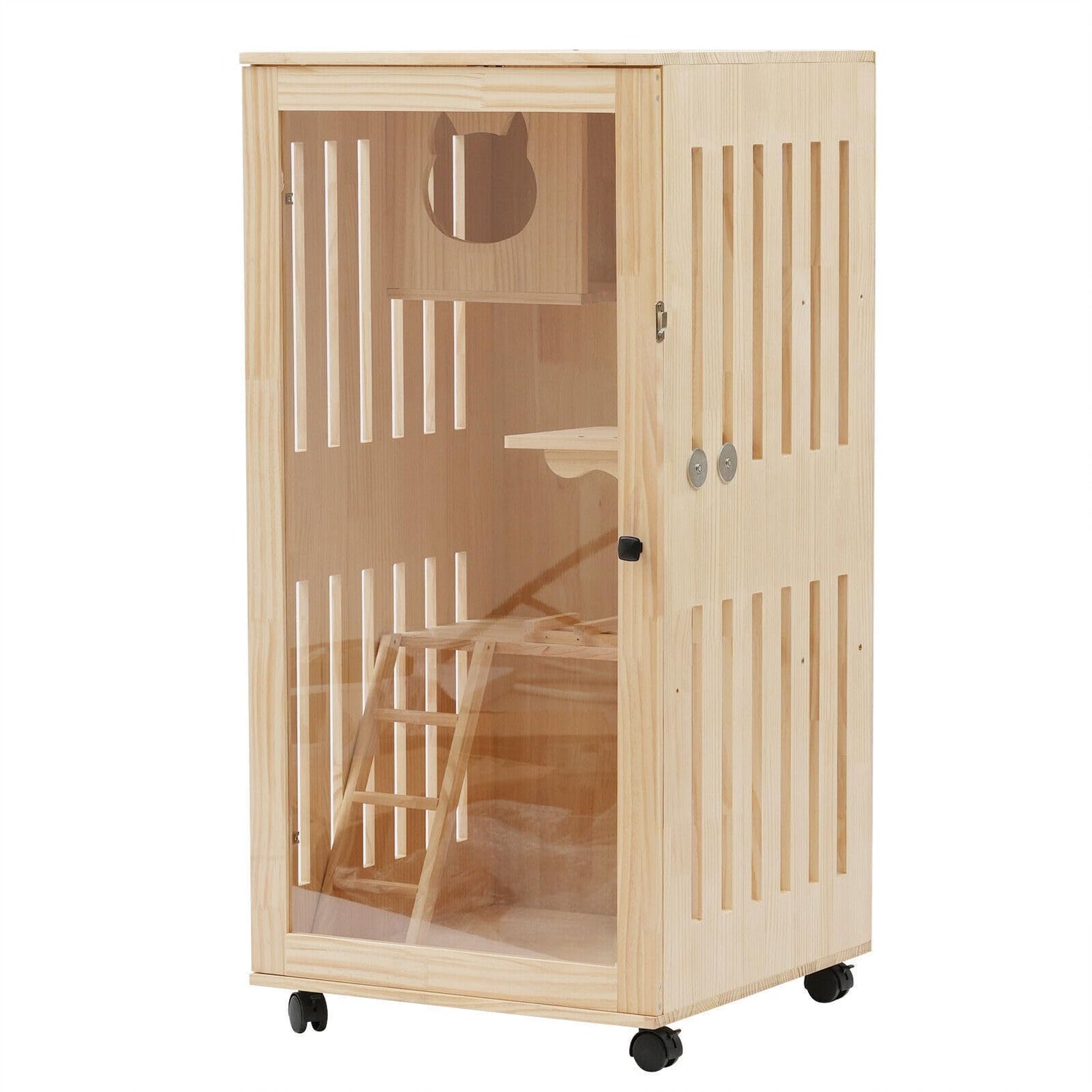Wooden Cat House, Large Wooden Indoor Cat Enclosure Catio Cage with Ramp and Covered Cat House Kit, Enclosed Cat Condo w/Wheels for Cats Kittens
