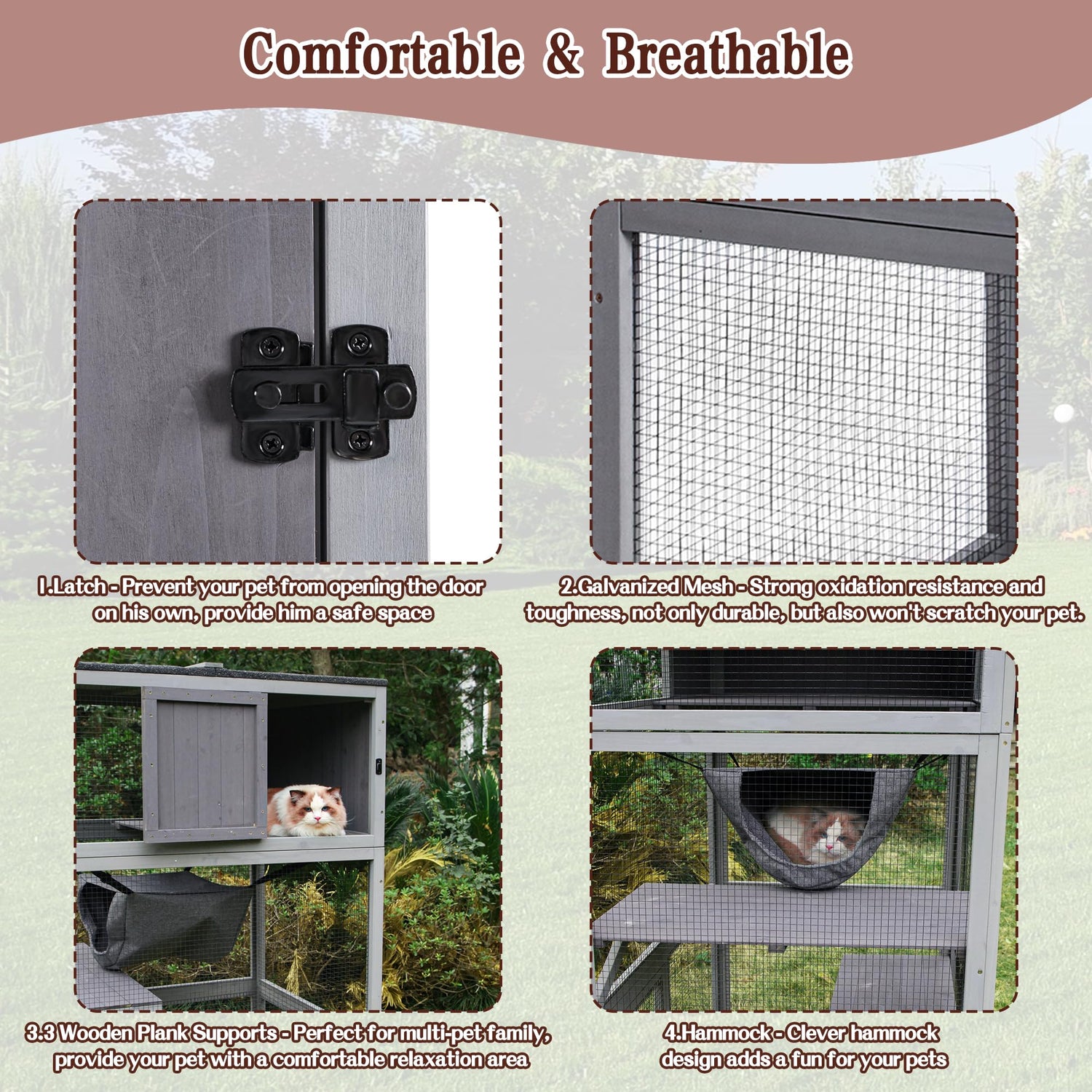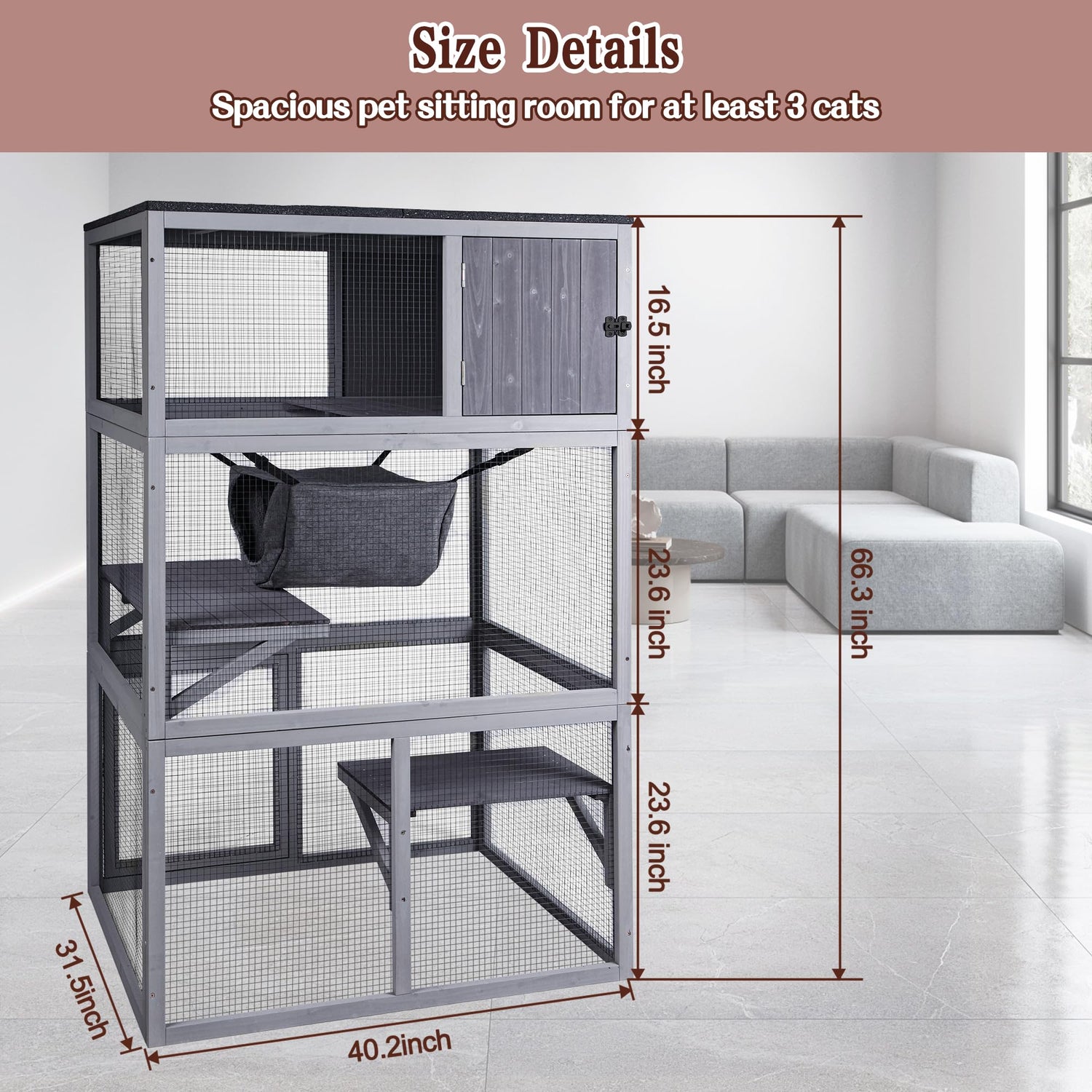 Wooden Cat House Outdoor Cat Enclosure with 3 Floors and Weatherproof Roof Indoor Large Cat Catio for Cats with Hammock & Resting Box