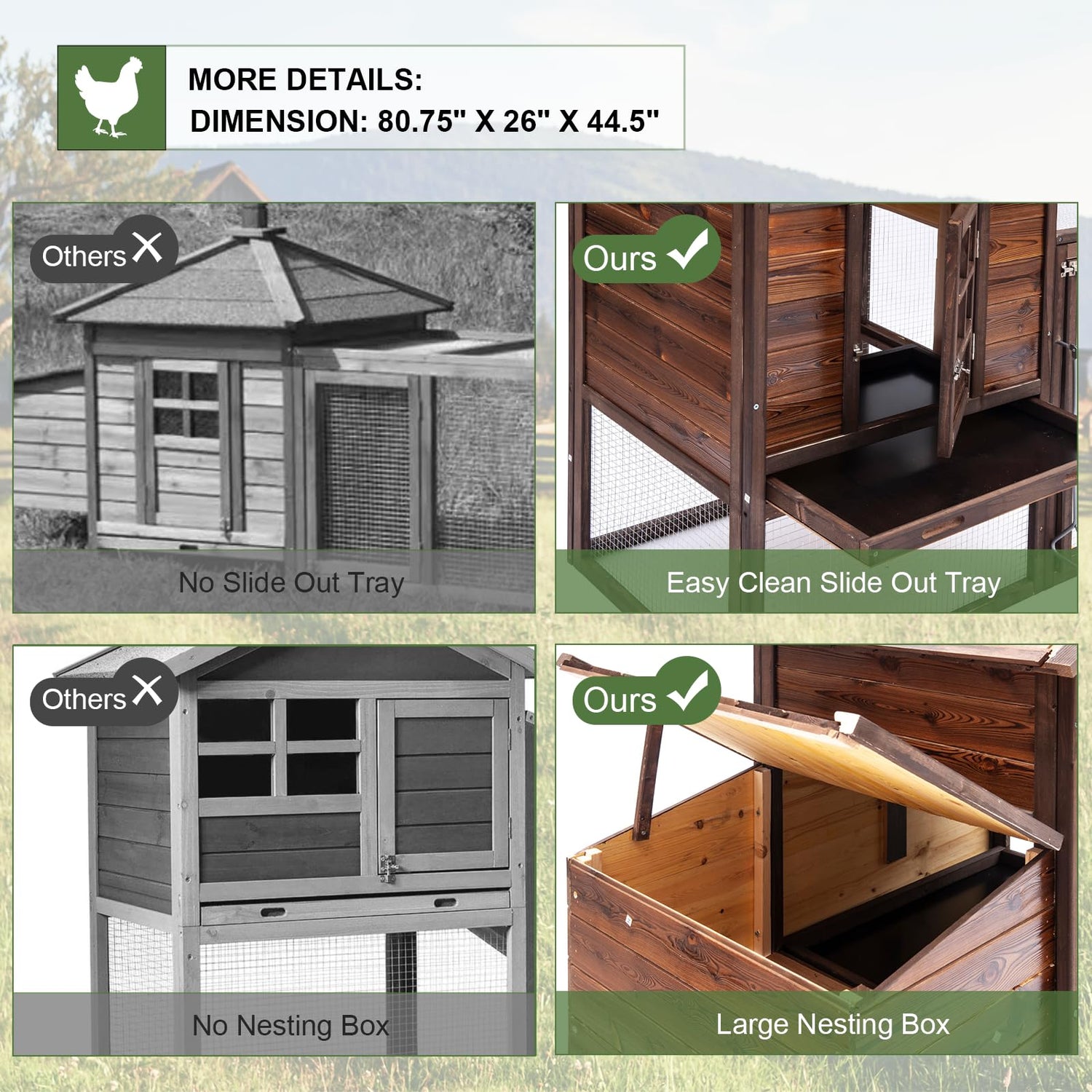 Wooden Chicken Coop Large Walk-in Outdoor Hen House with Nesting Box and Run,Poultry Cage Rabbit Hutch Waterproof UV Panel Cover for 2-4 Chickens 80''H Deep Brown #821 (80.75" L x 22" W x 44.5" H)