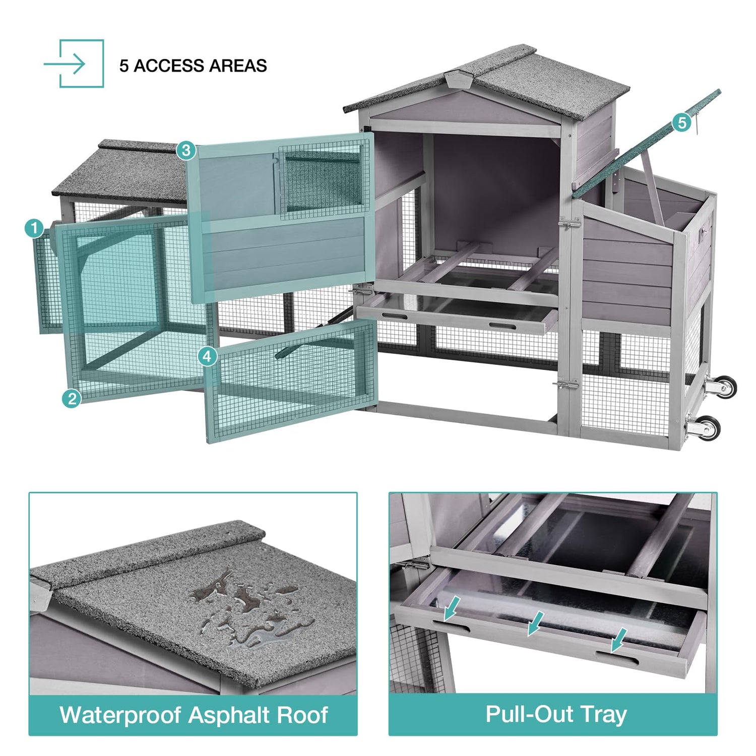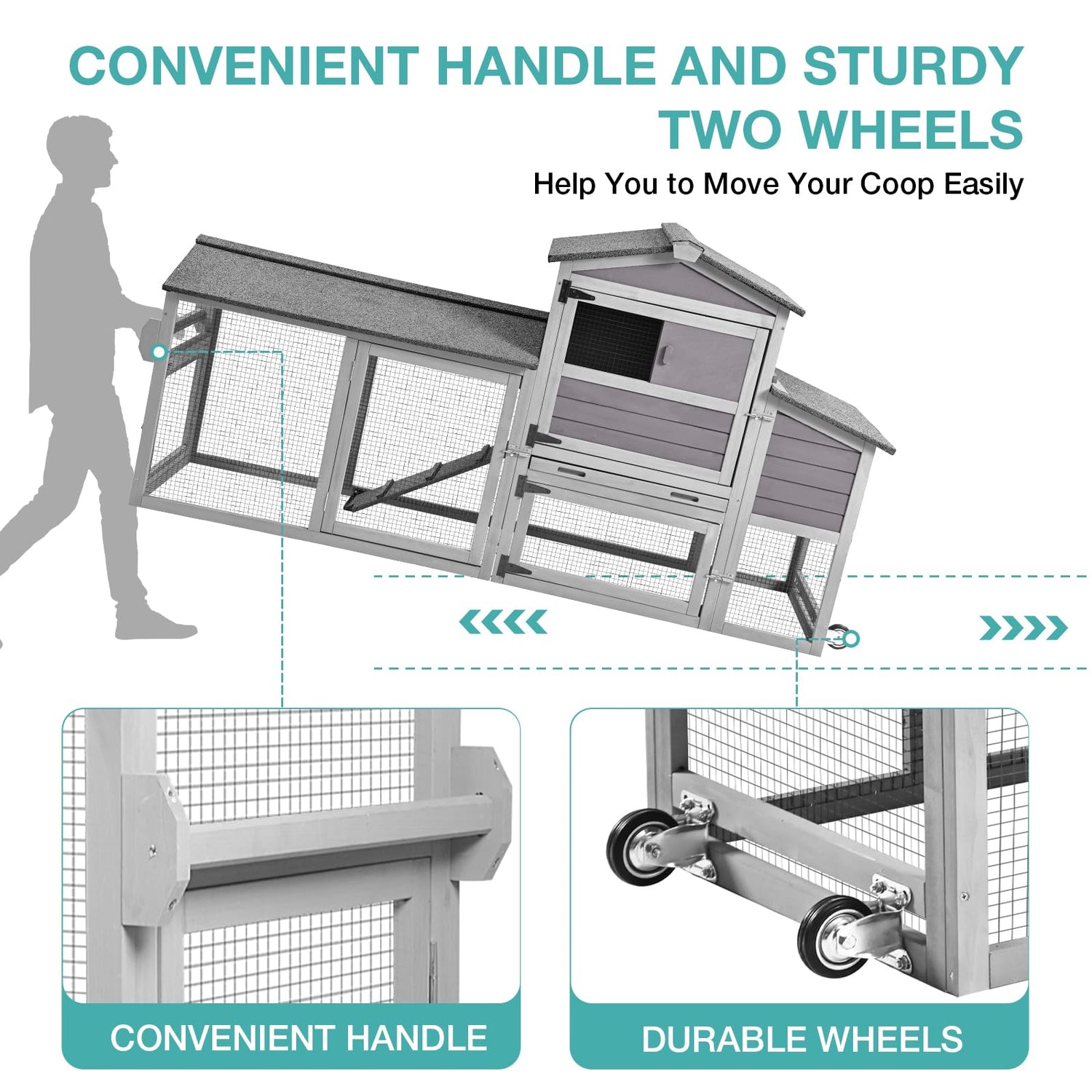 Wooden Chicken Coop with Wheels, Mobile Hen House 80" Outdoor Poultry Cage with Nesting Box Run