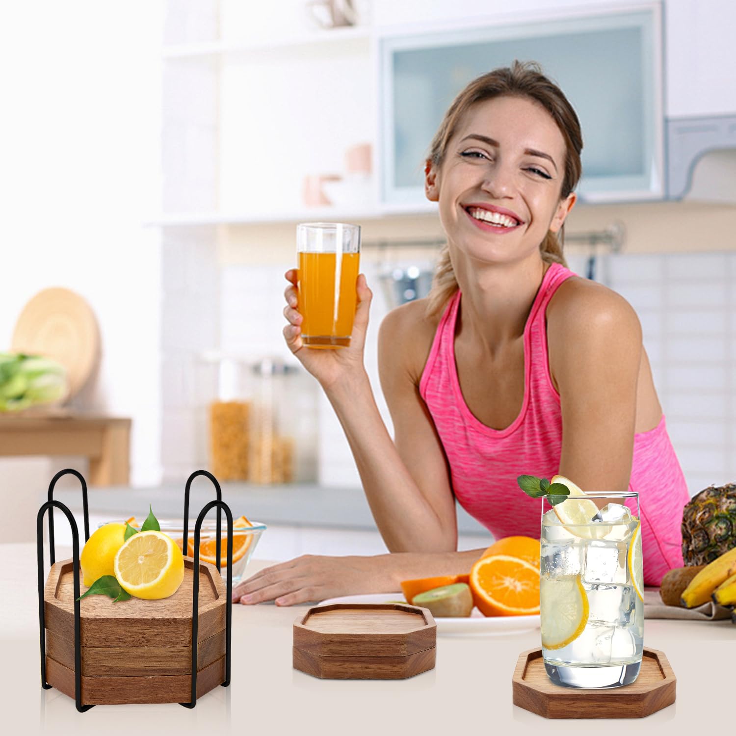 - Wood Coasters Set Of 6: These wooden coasters are crafted from premium acacia wood with exquisite hand-carved octagonal design, ensuring durability and elegance for long-lasting use.