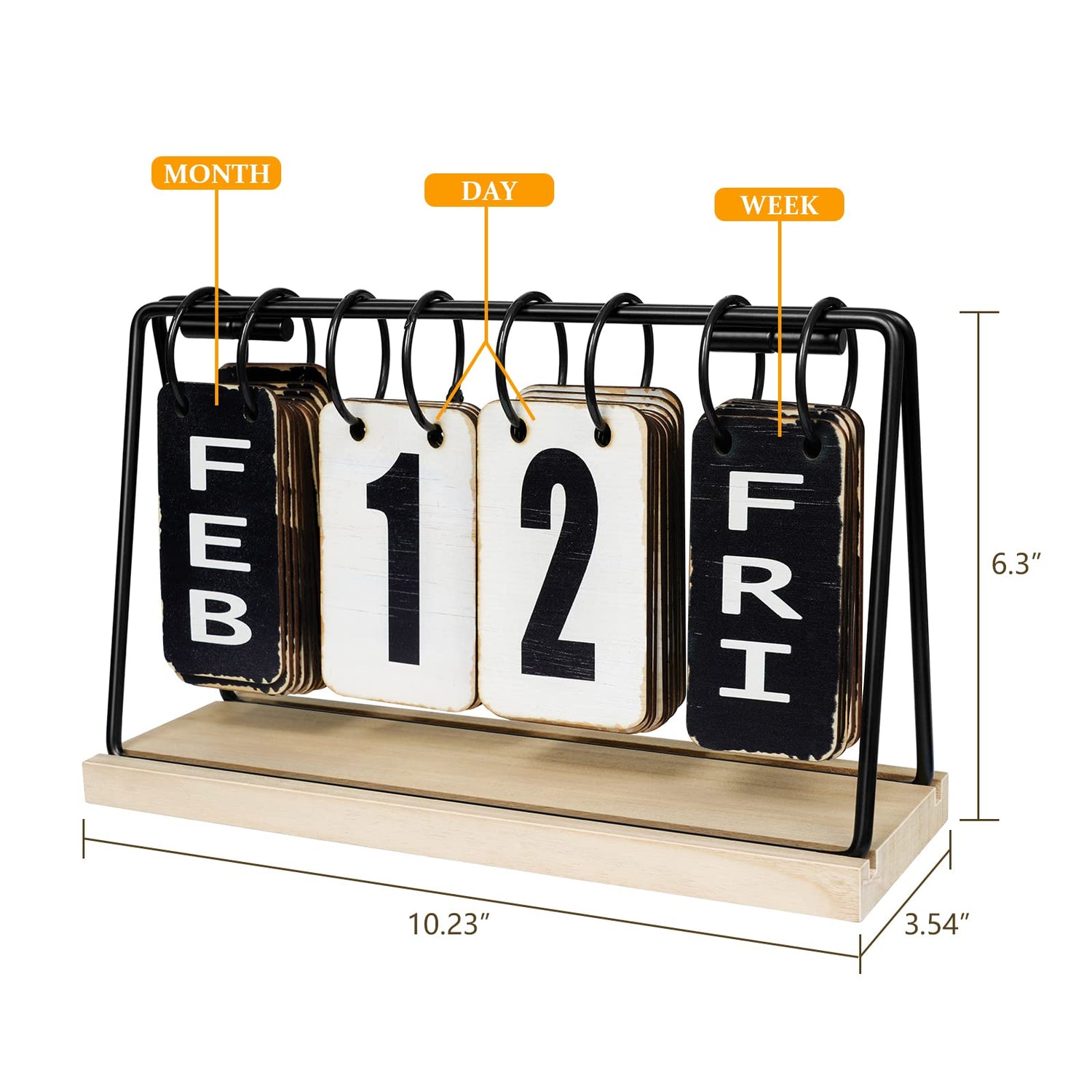 Details: EruiYin Vintage-style perpetual desk calendar provides an attractive look for your home and office, as a warm company when working or playing at your deskWooden Perpetual Flip Calendar Simplicity of the large font quickly shows month and date, day of the week Easy to change the date Sturdy pieces that are pleasant to the touch Brings a fresh look to your space Specifications:Product Size: 10.23 x 3.54 x 6.3inchColor: Black, WhiteMaterials: Metal, WoodStyle: Vintage, Farmhouse, Rustic - Fits perfect with your home office decor.In the New Year, it would be a great gift to father, mother, friends, and teachers, it is also an attractive and decorative accessory for home and office decor, window sill, kitchen counter, cabinet, living room, etc.