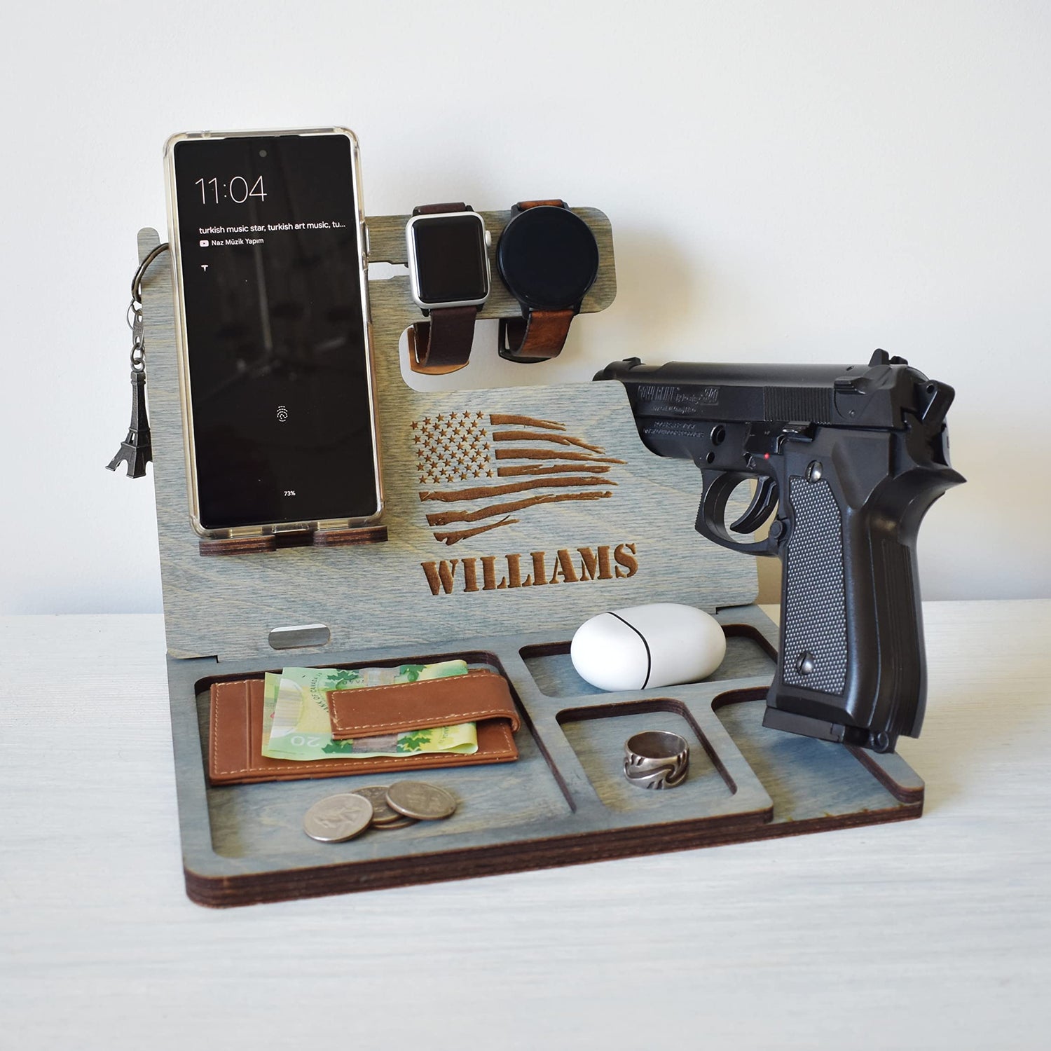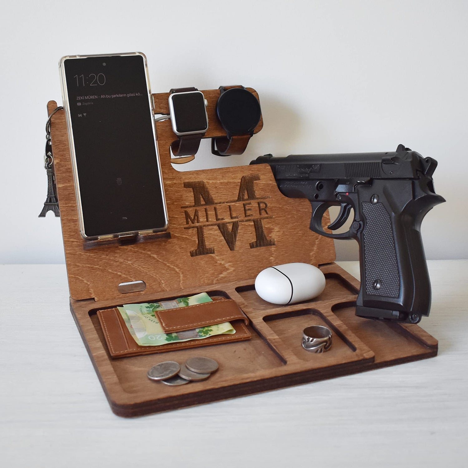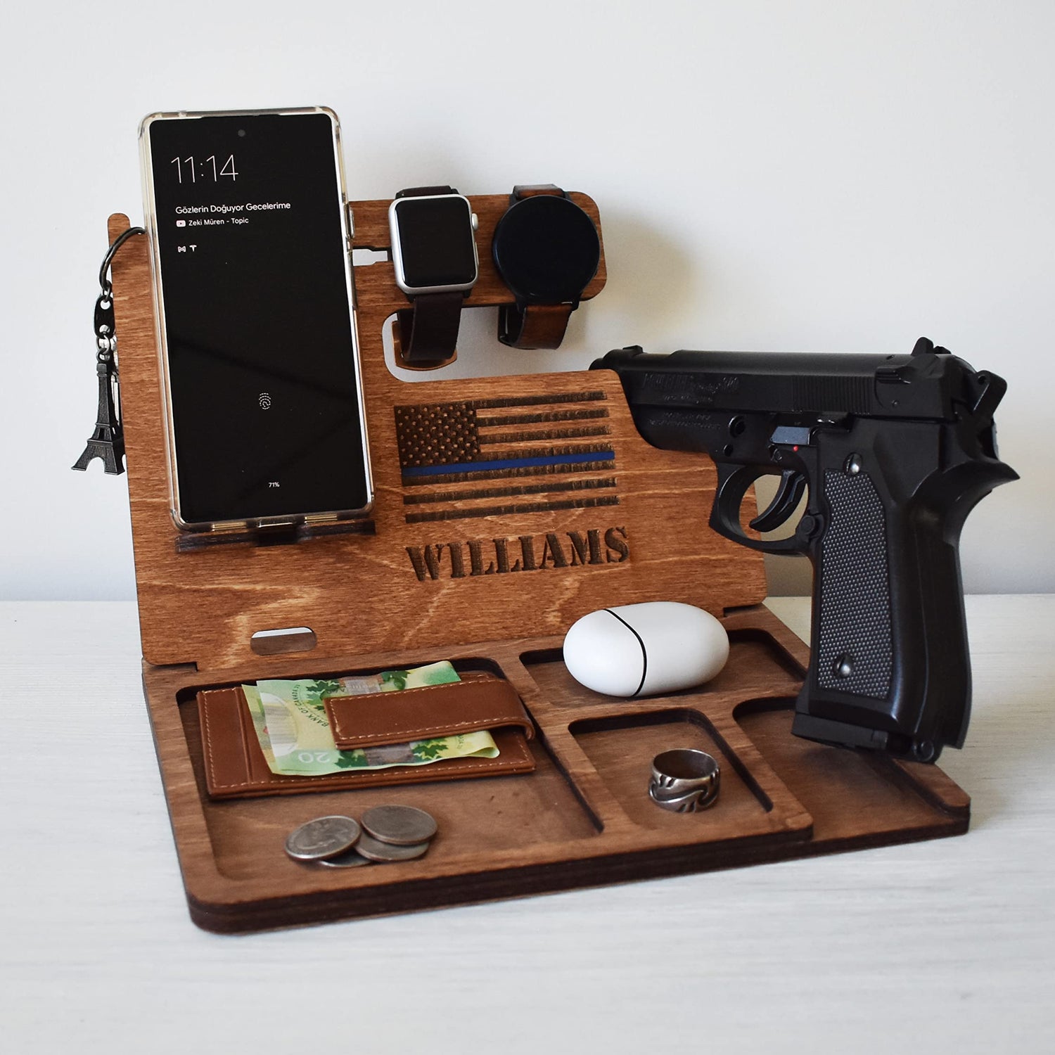 Details: Wooden Docking station is a great gift option for holidays and any other special events. Our design is unique and functional. It is made from high quality plywood wood. It has two pieces which you will need to insert them into each other. This docking station can accommodate Gun, Apple Watch and Apple Watch charger, all iPhone models and other smartphones such as Samsung, Nokia, Nexus, HTC, Pixel etc. Docking Station will help to keep your office or home desk organized. It will hold your gun, phone, wallet, keys, glasses, wedding ring, necklaces, pen or pencil.