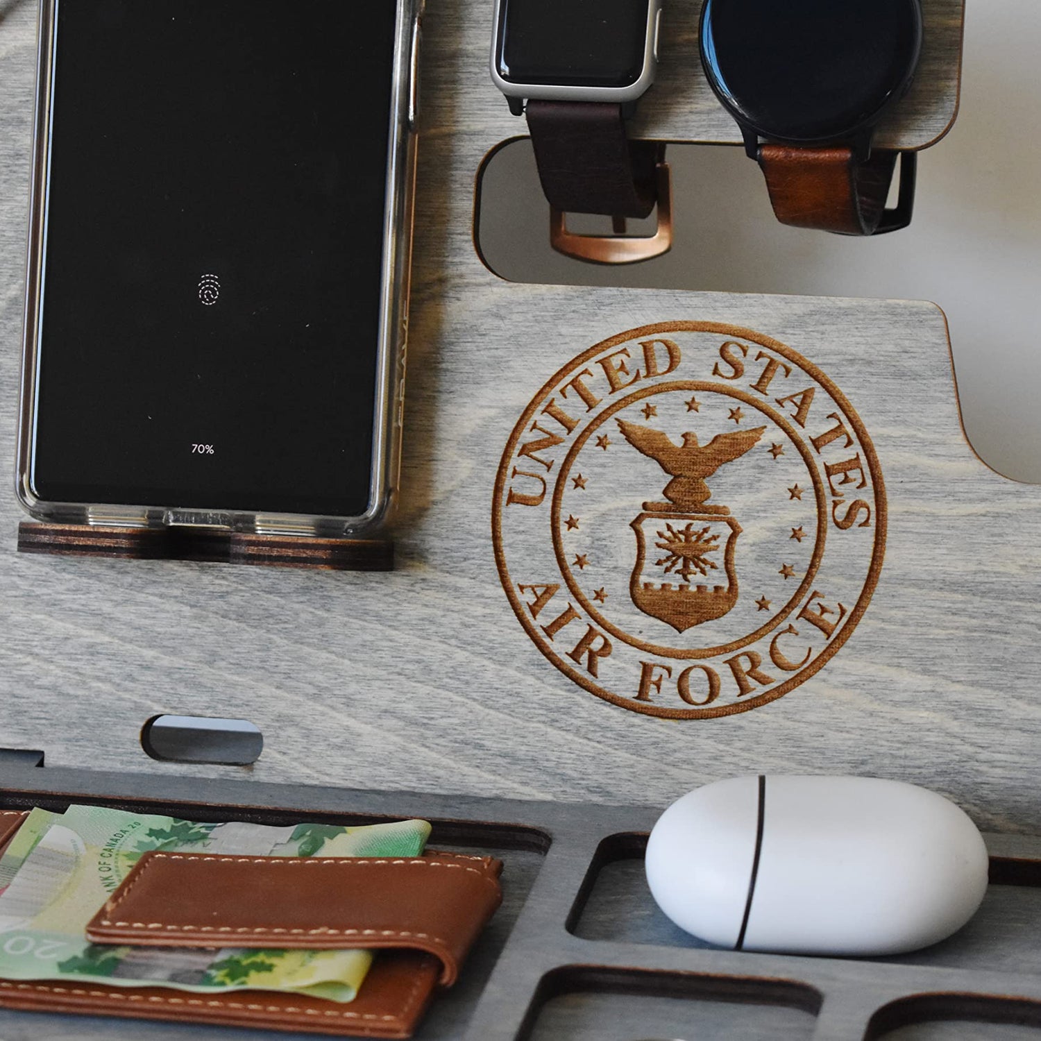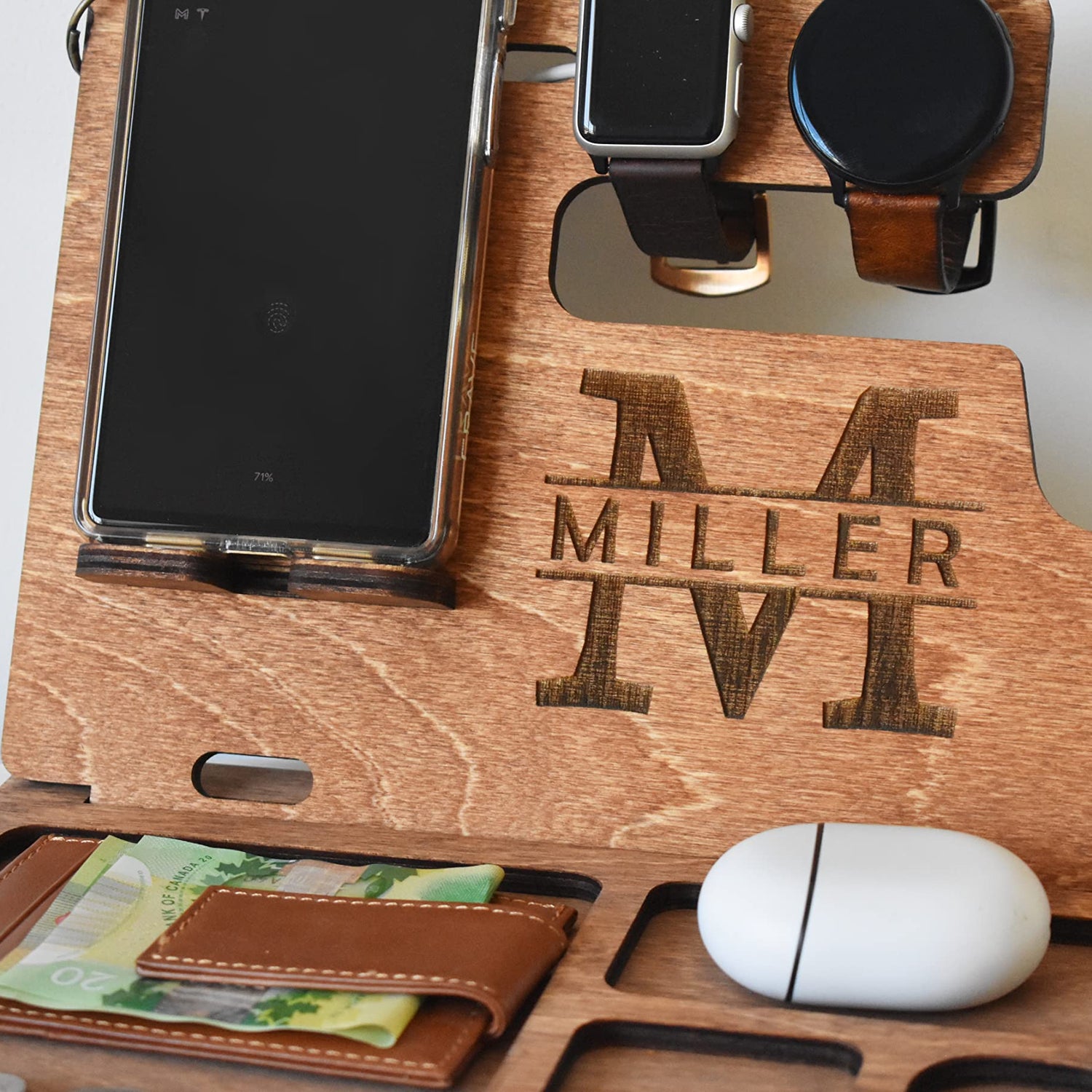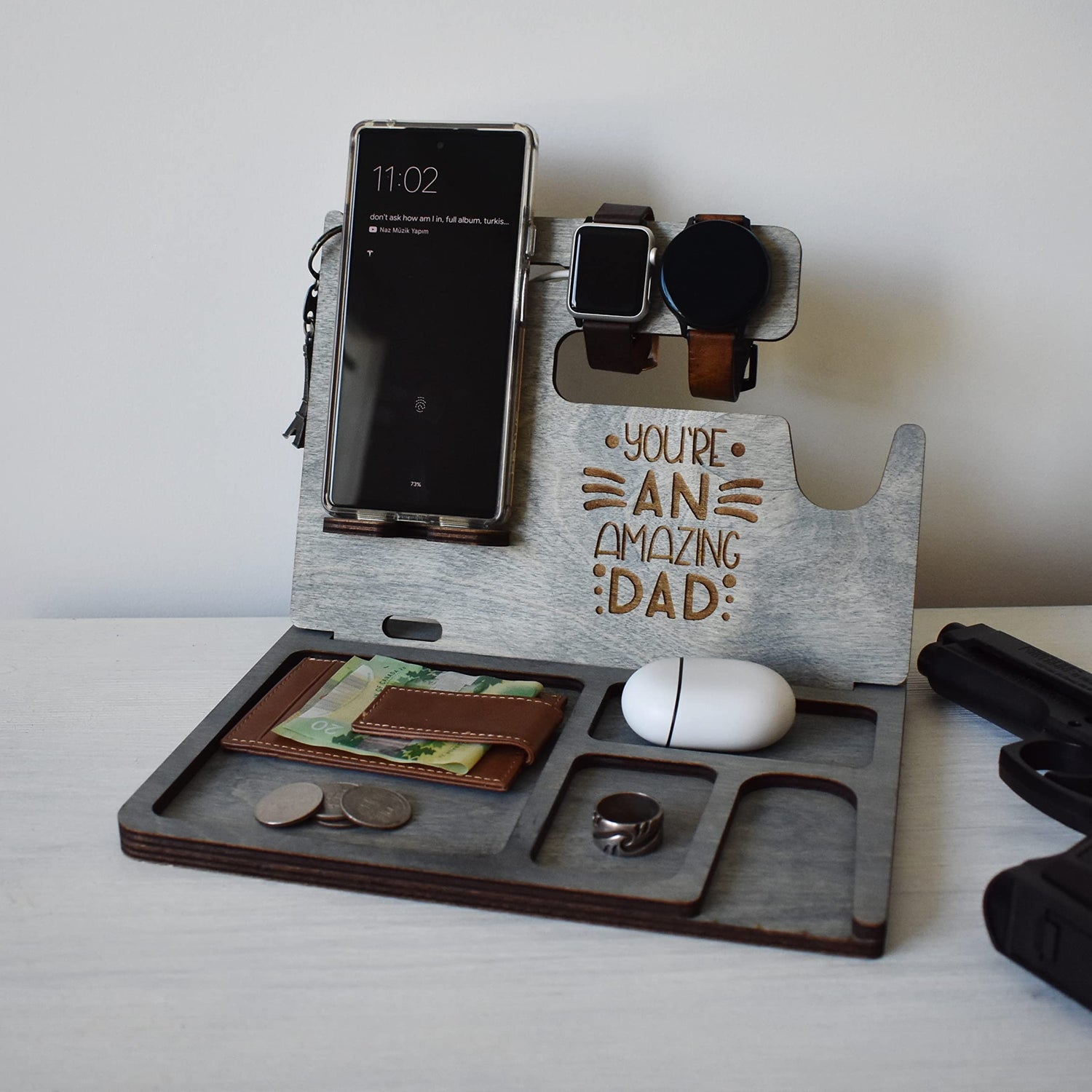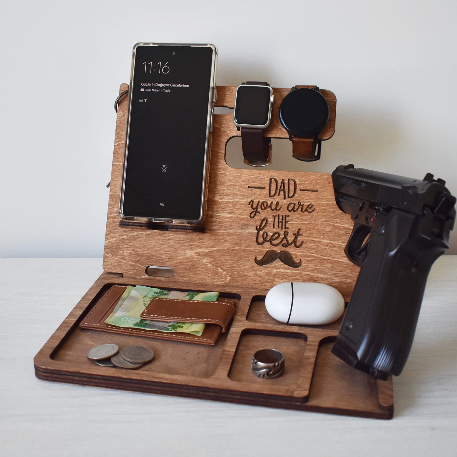 Details: Wooden Docking station is a great gift option for holidays and any other special events. Our design is unique and functional. It is made from high quality plywood wood. It has two pieces which you will need to insert them into each other. This docking station can accommodate Gun, Apple Watch and Apple Watch charger, all iPhone models and other smartphones such as Samsung, Nokia, Nexus, HTC, Pixel etc. Docking Station will help to keep your office or home desk organized. It will hold your gun, phone, wallet, keys, glasses, wedding ring, necklaces, pen or pencil.