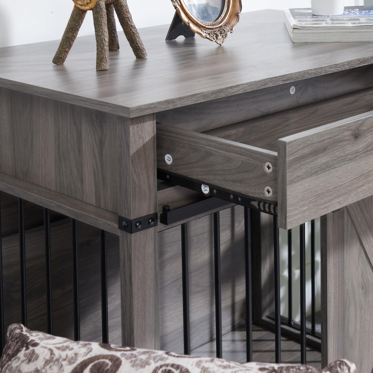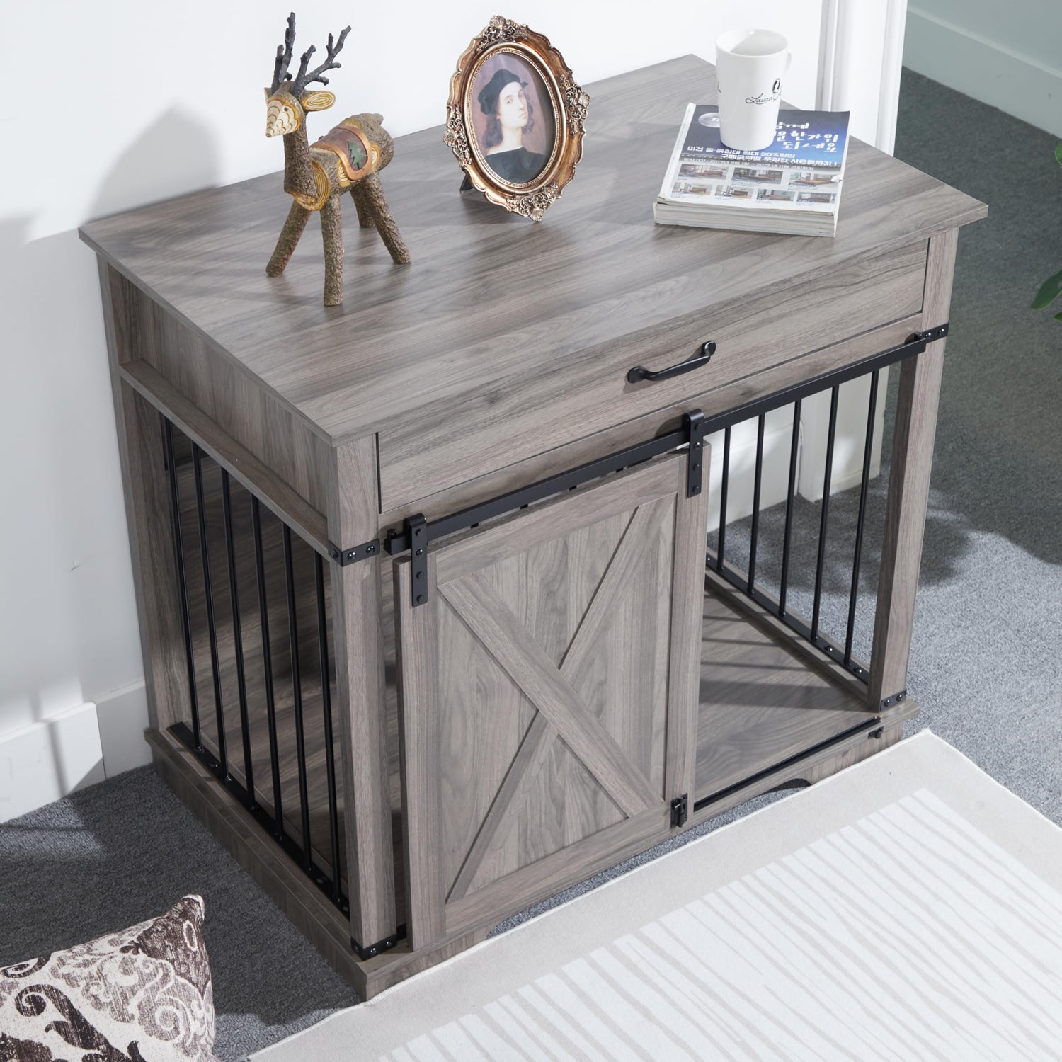 - Convenient Ample Space: Equipped with a convenient drawer storage area, this crate allows you to neatly store your pet's toys, food, and other essentials. This design enhances usability and helps save space, keeping your living area tidy and organized. Meanwhile, the dog cage adopts a sliding barn door design, which is easy to open and close without wasting space.