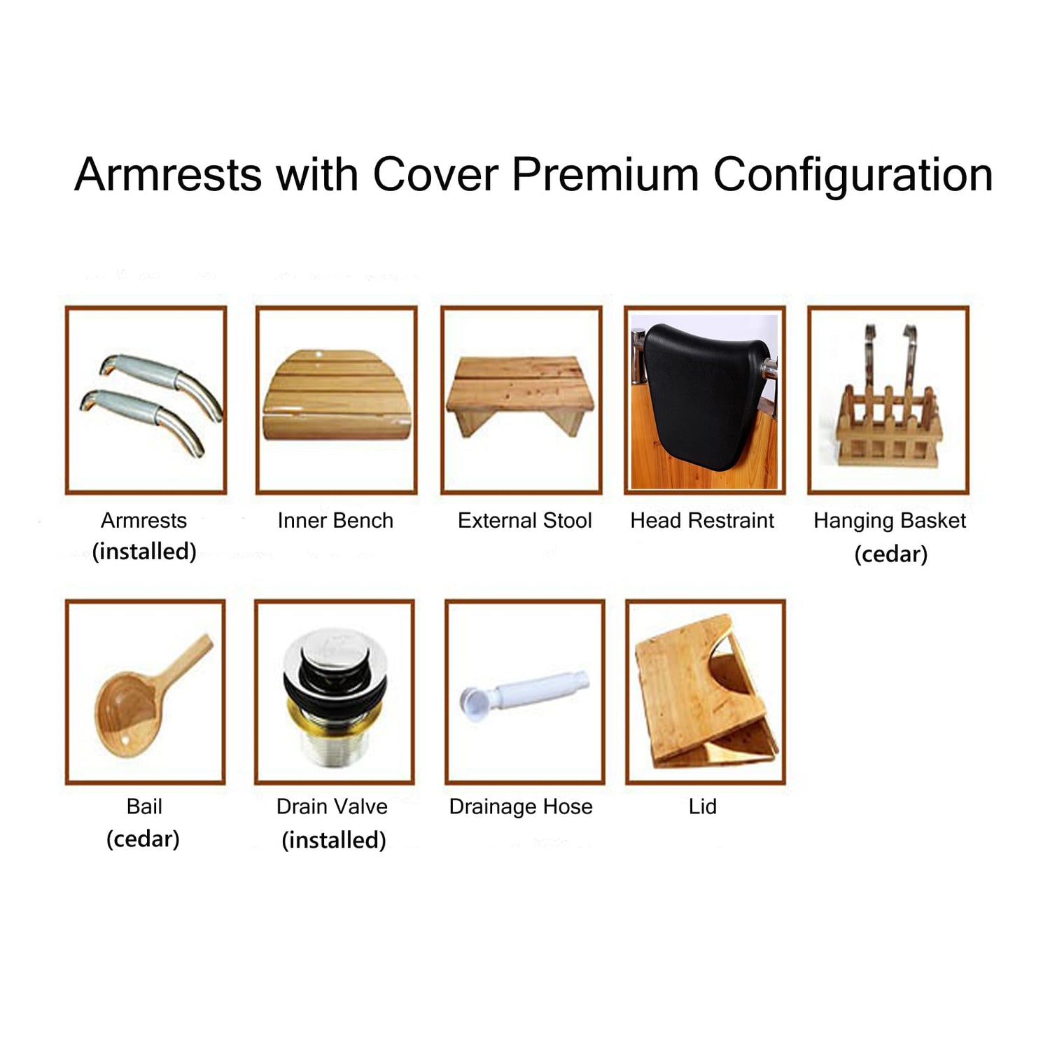 - Armrests with Cover: stainless steel armrests, inner stool, scoop, drain valve, outer stool, stainless steel headrest, hanging basket made of cypress wood, drain hose, cover.
