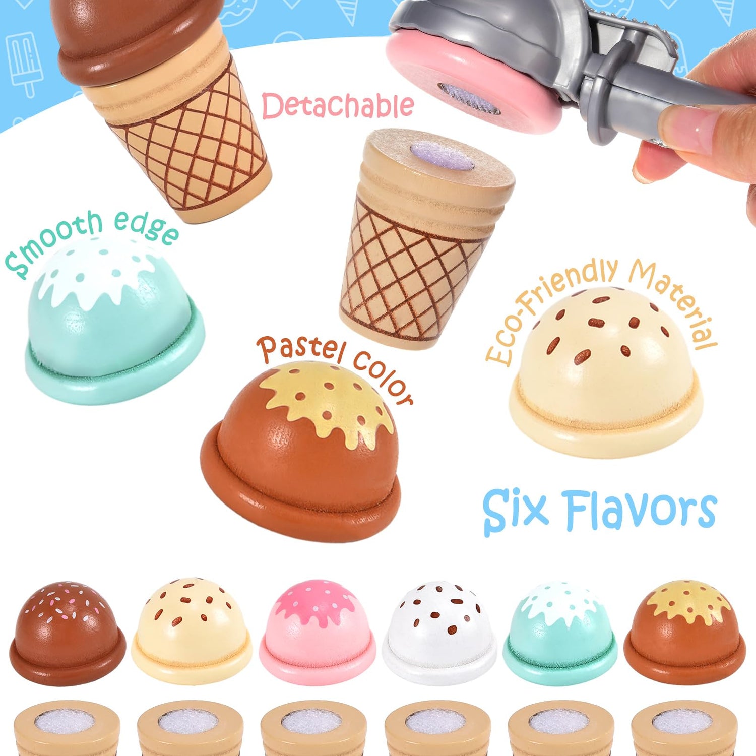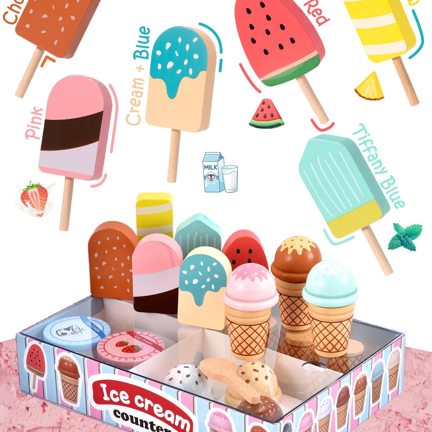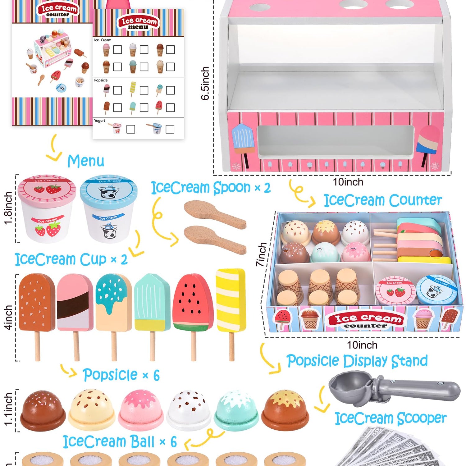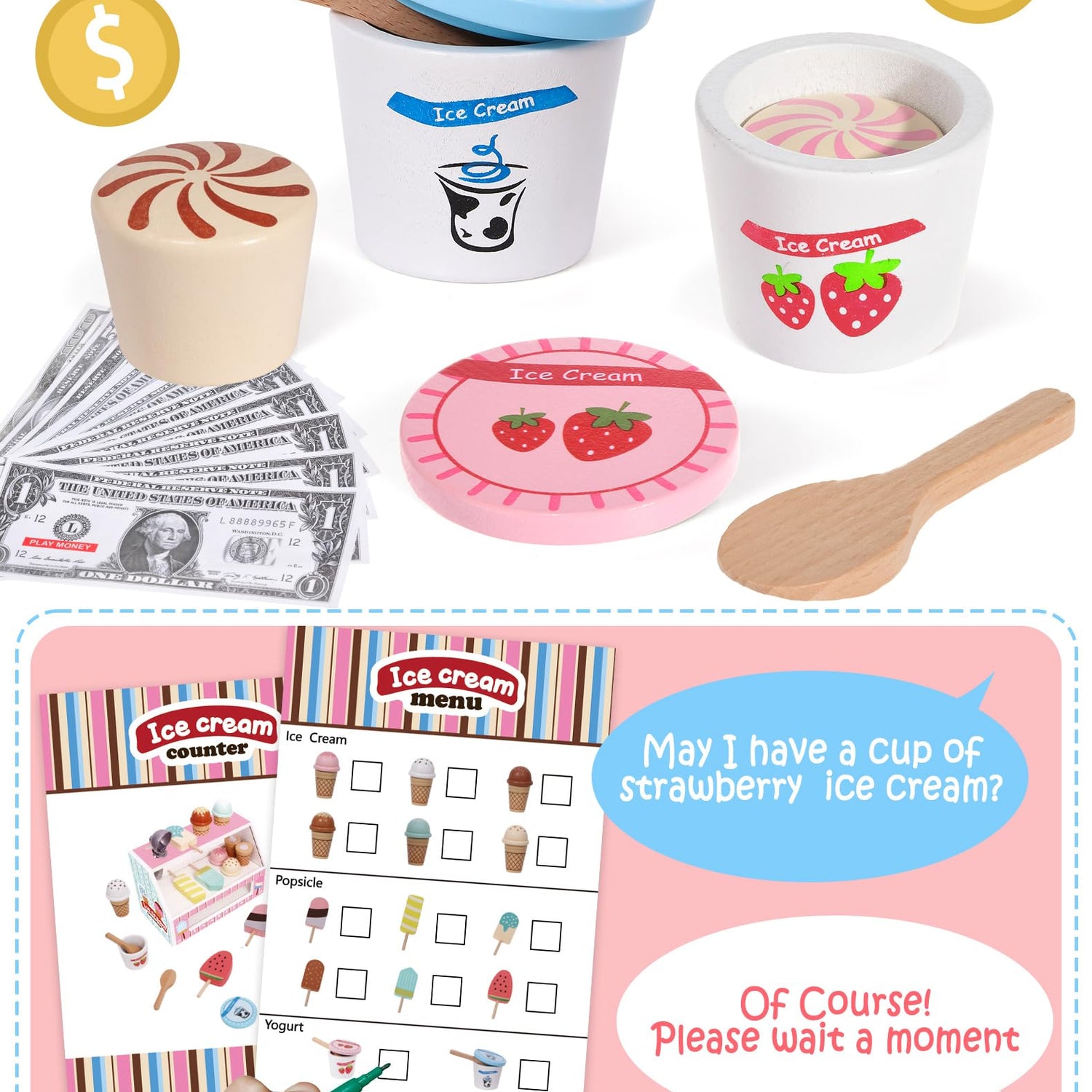 • [🍦Cones & Ice Cream & Popsicles]Kids love to play role-playing games. Play an ice cream game with the kids! Our set consists of 1 stand, 6 wooden ice cream bars, 6 ice cream cones, 2 cans of ice cream, 2 wooden scoops, 1 ice cream scoop and a set of toy notes and coins, plus a menu.Our package is complete, your child can always be an ice cream shop manager, which will become a pleasant and unforgettable memory for kids.