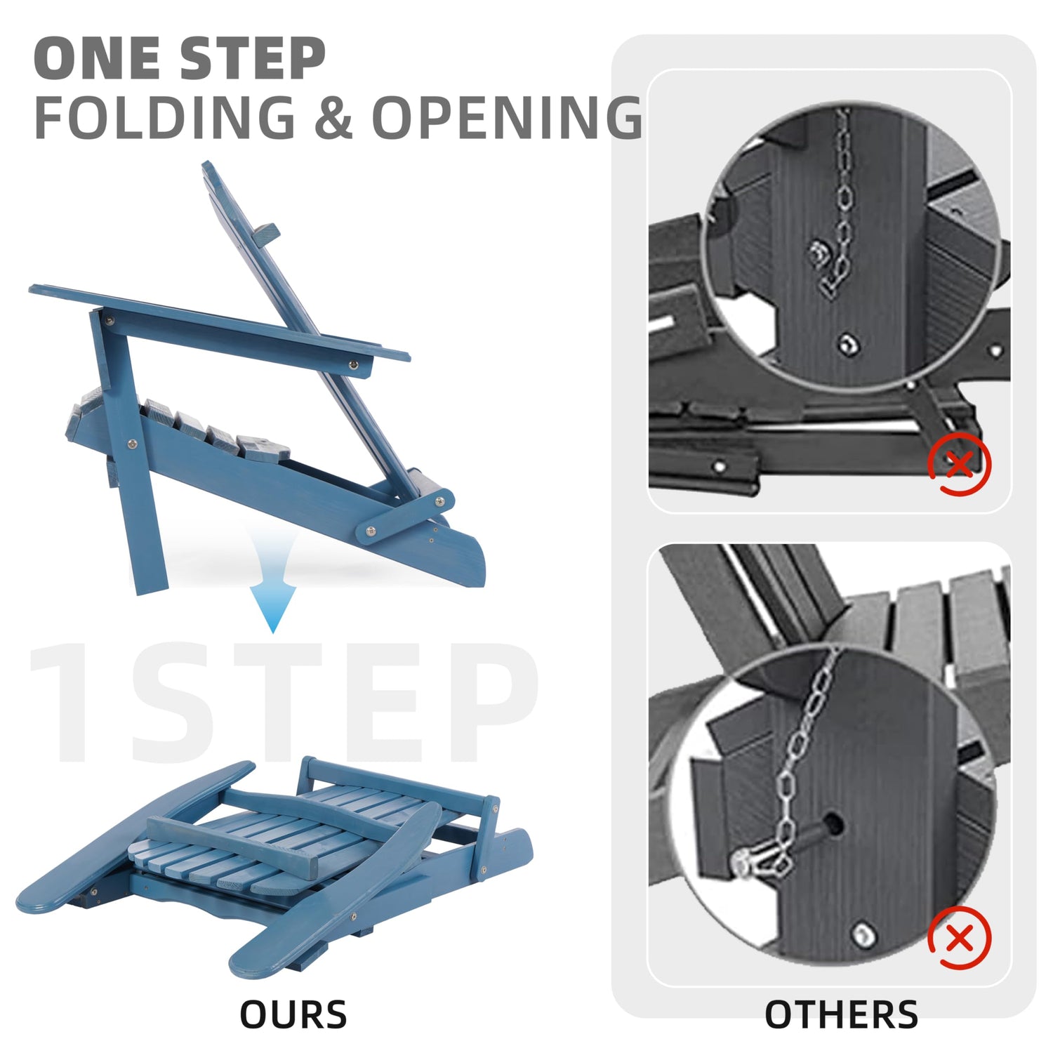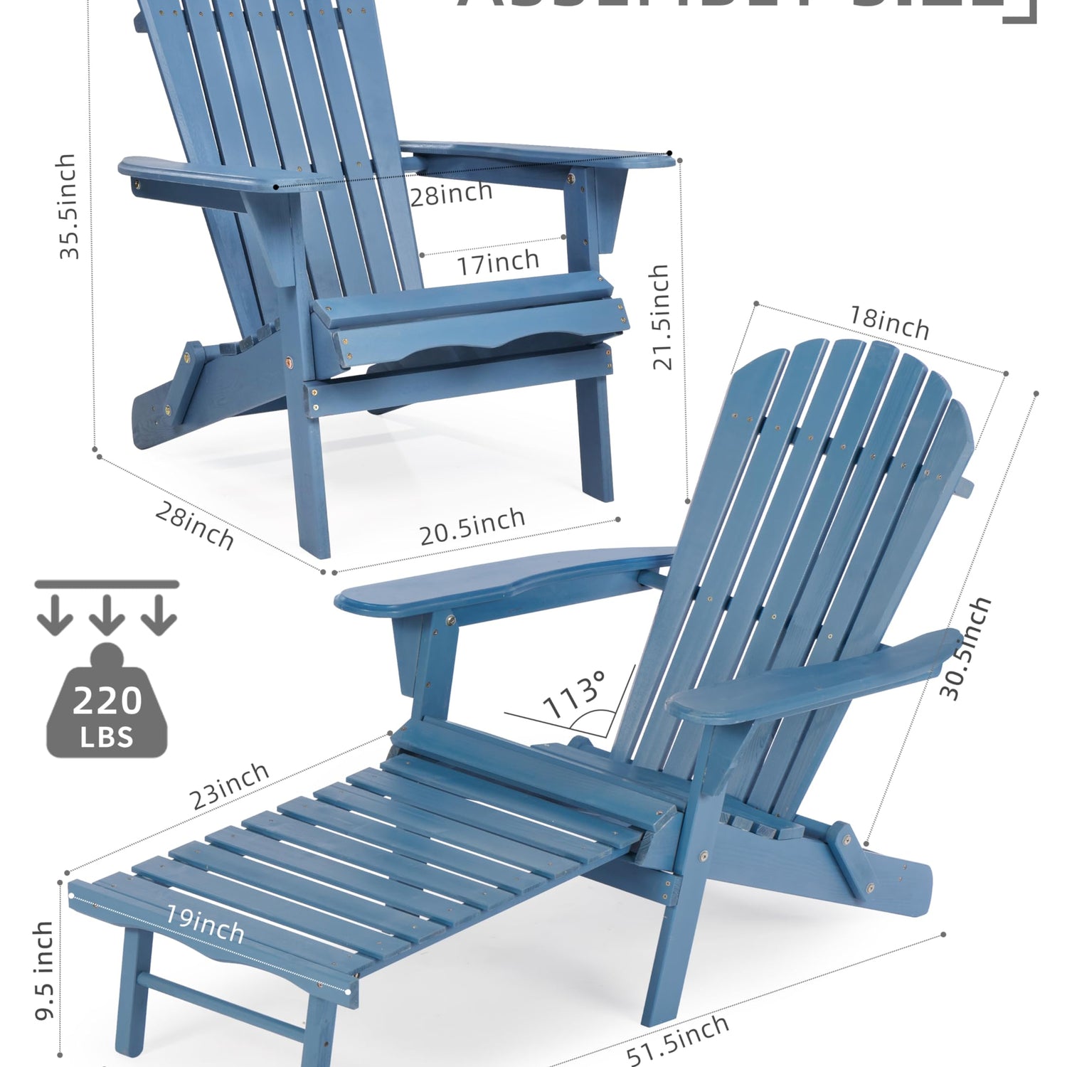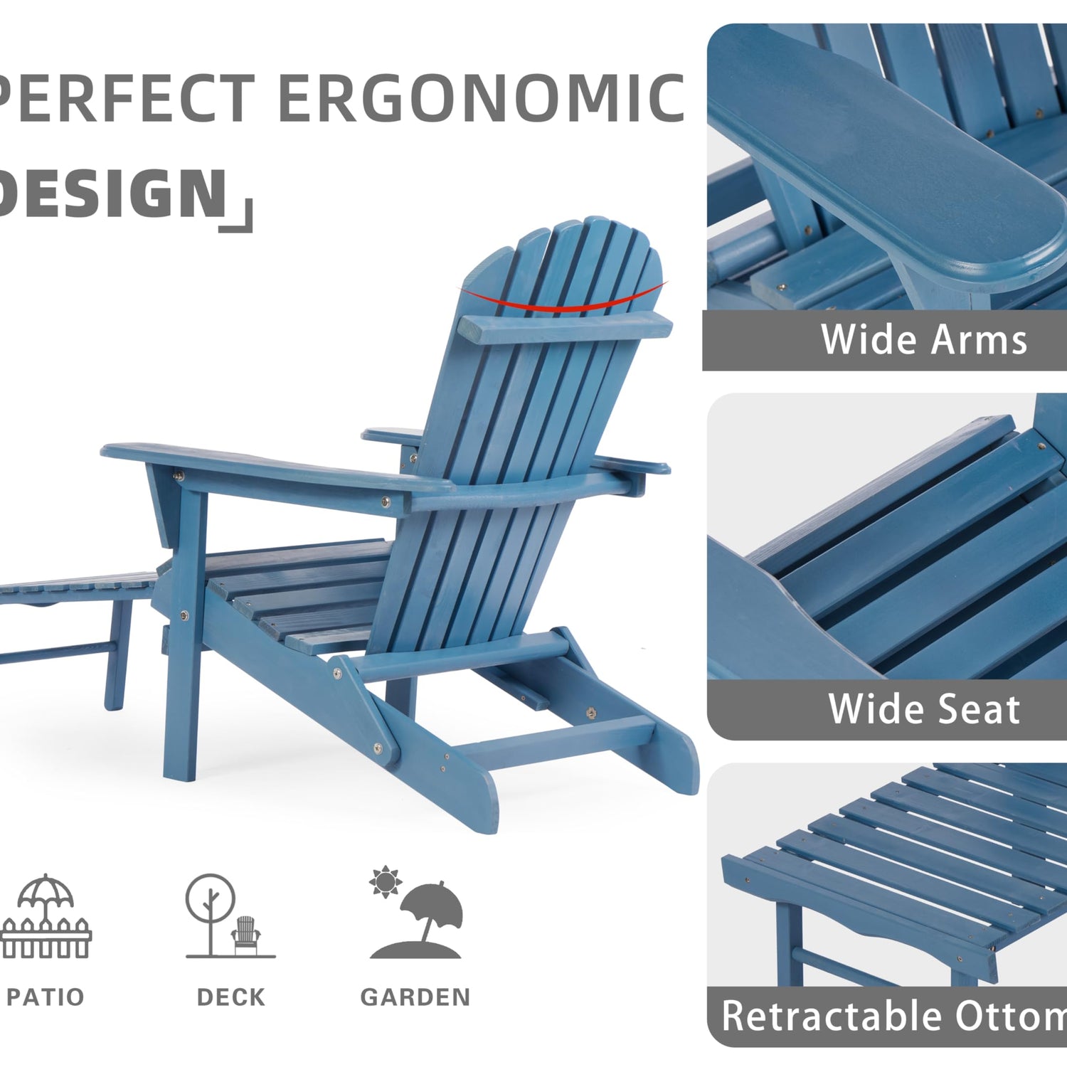 Details: Wooden Outdoor Folding Adirondack Chair with Ottoman, Pre-Assembled BackRest & SeatBoard, Wood Patio Chair for Garden Backyard Porch Pool Deck Firepit