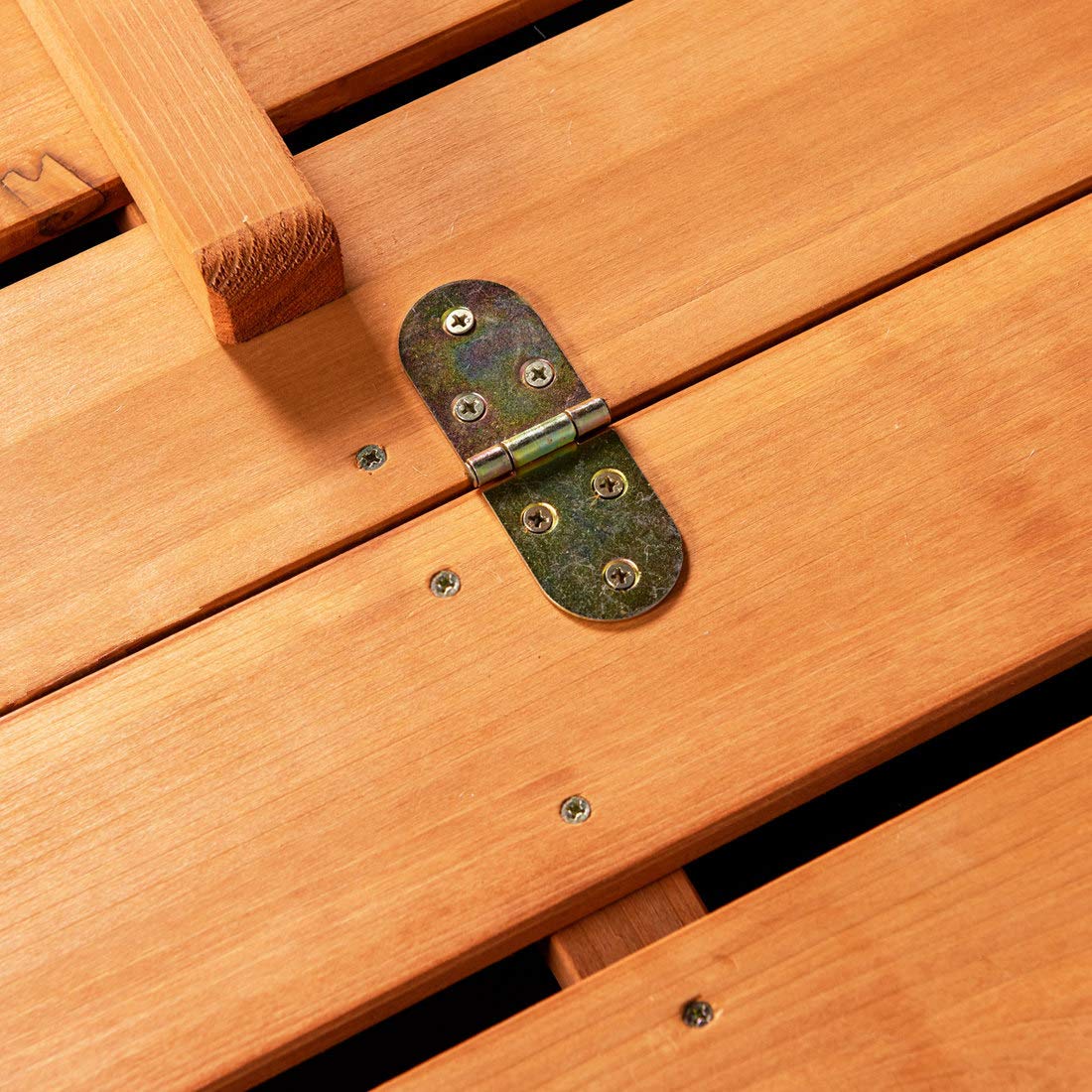• Upgraded to a stronger hinge, will not easy to tear the wood, Benches fold flat to cover and protect the sand when play time is done!