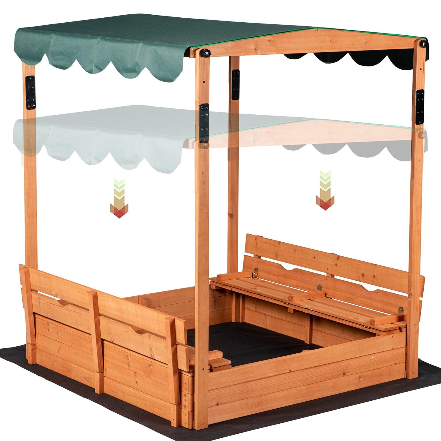 It features two comfortable benches and a canopy top for shade. Sandbox measures 46.5" L x 46.5" W x 9.5" H (57" H to the top of the canopy).