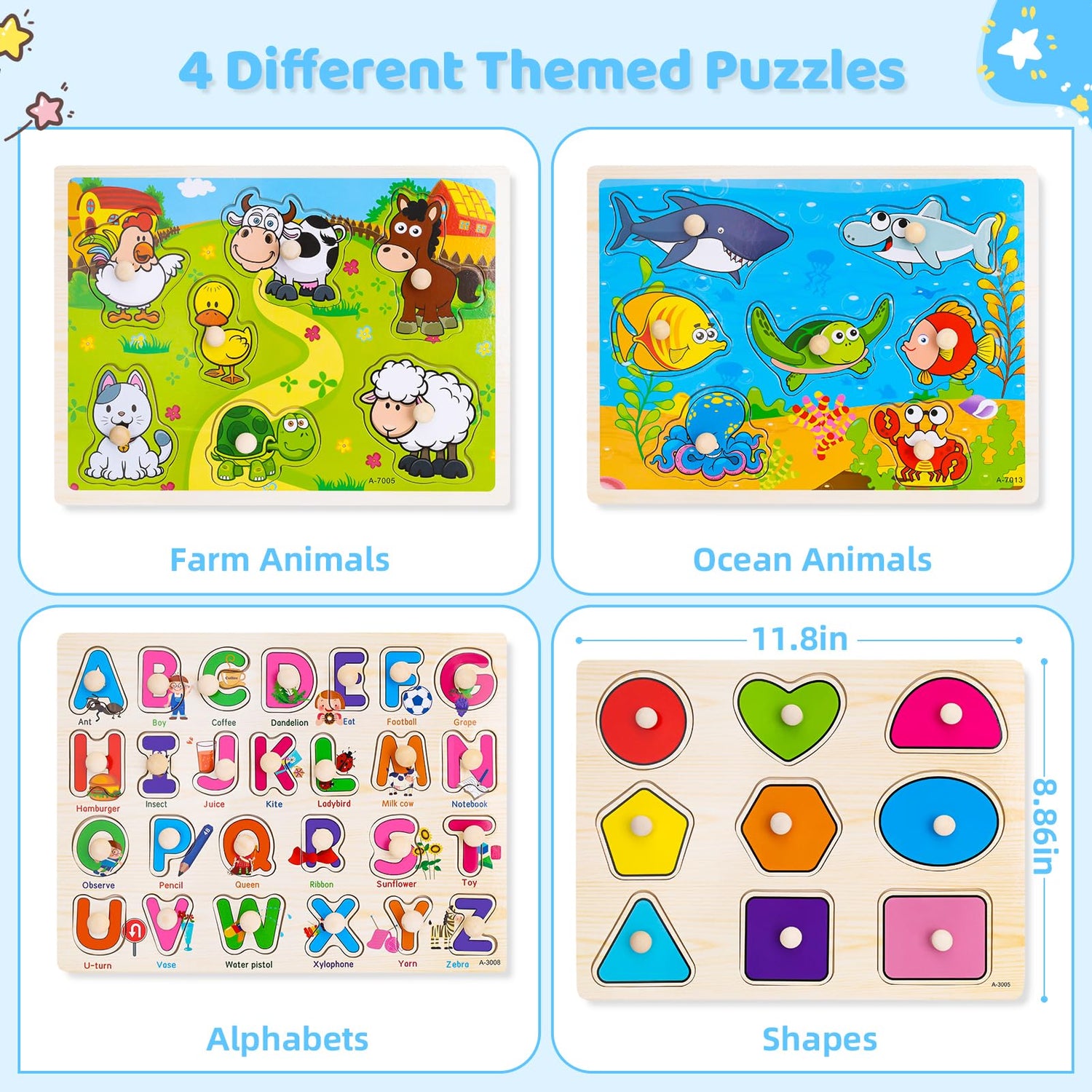Wooden Peg Puzzles for Toddlers 2 3 4 Year Old, 4 Pack Montessori Toys Preschool Learning Puzzles for Toddlers 1-3 with Animals, Shapes, Alphabet, Wooden Toddler Toys Gifts for Kids Boys Girls