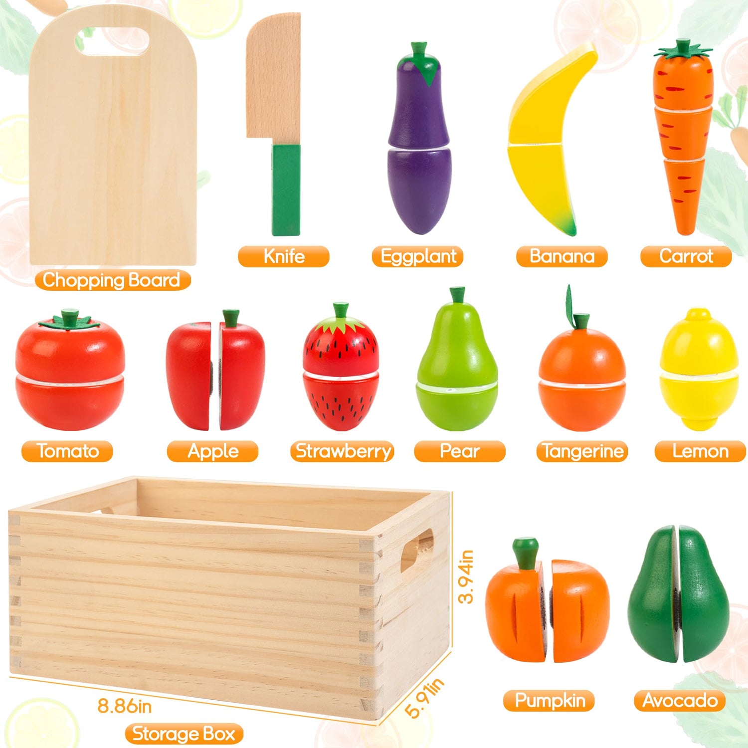 - 【Toddler Cutting Food Set】The wooden toy food set including fruits and vegetables comes with a wooden pretend knife and chopping board, the toy food which are held together with velcro will make a fun and real crunch sound when sliced, offering a realistic kitchen experience for toddlers.