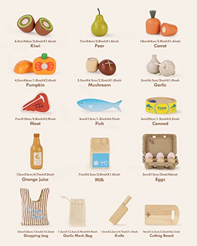 - EASY TO STORE AND CARRY: Our kitchen toys set comes with wooden knives, cutting boards, cuttable food toys and more, while the included unique shopping bag gives you an easy way to keep them neatly organized or to take with you wherever you go.