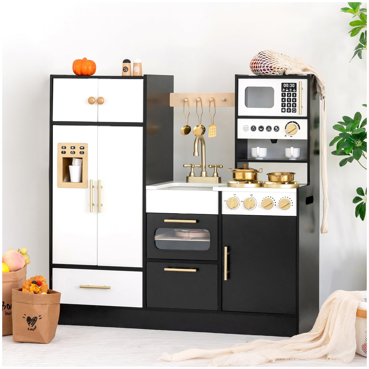 - Interactive Play Kitchen for Toddlers & Kids: This wooden play kitchen set includes essential features like a realistic faucet, oven and ice maker. Perfect for kids aged 3+, it encourages imaginative role play that develops sensory and motor skills