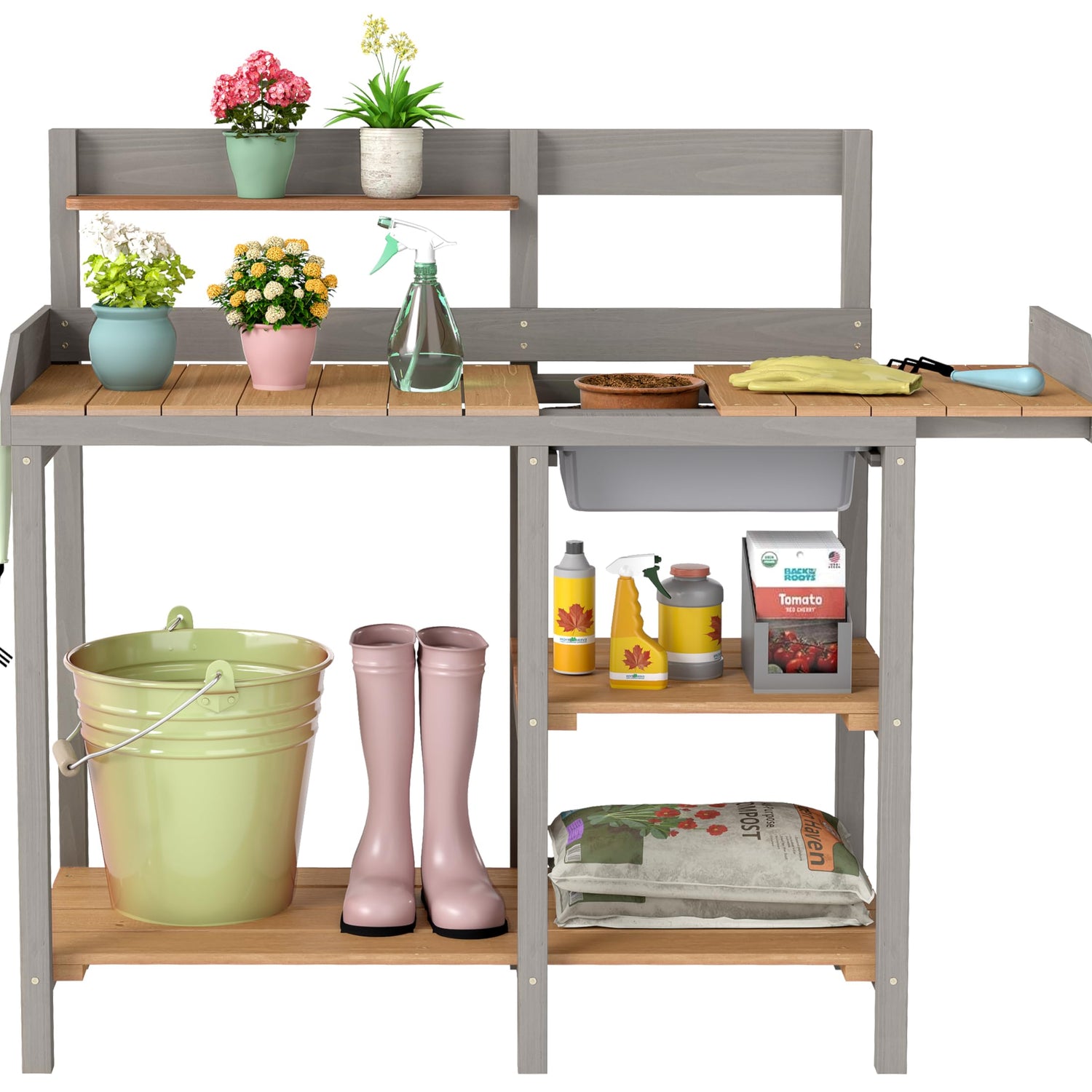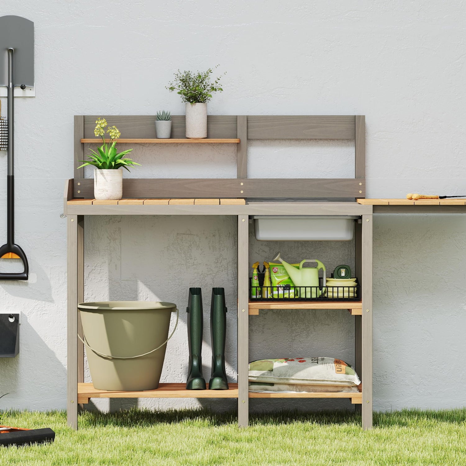 Wooden Potting Bench Table with Sink, Outdoor Garden Table Work Bench with Shelf, Workstation for Outside Patio Lawn