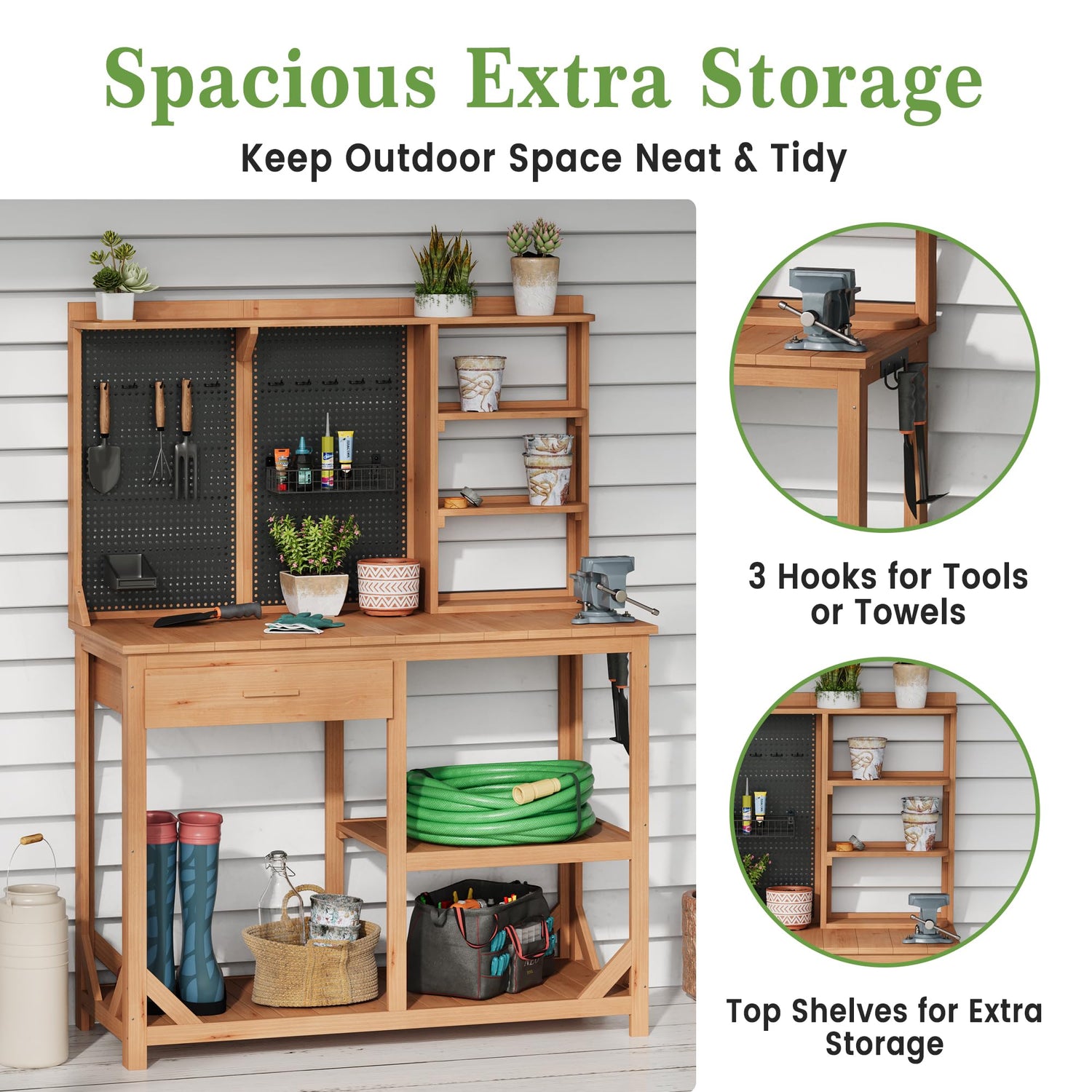 Wooden Potting Benches for Outside, Large Garden Potting Table with Drawers, Outdoor Work Bench with Storage, Holey Board and Hooks, Garden Plant Workbench Patio Workstation for Backyard, Natural