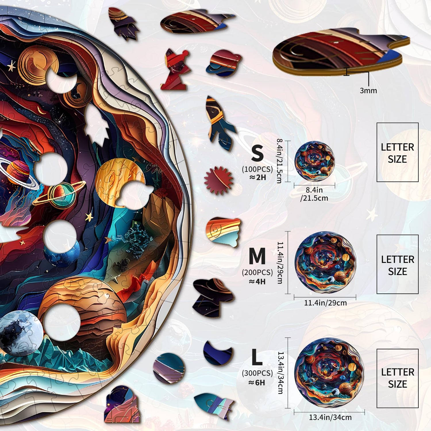 - 🪐[Exquisite Gift Packaging] : The packaging is wooden, and the size is about the size of a book. This puzzle is available in 3-4 sizes to satisfy any puzzle player of all levels. It can also be used on any holiday, birthday, Easter, Mother's Day, Children's Day, Father's Day, Valentine's Day, Thanksgiving, Halloween, Christmas, birthday gift,fun family games,for children, girls,friends, family, lovers, colleagues, kids teens,etc.