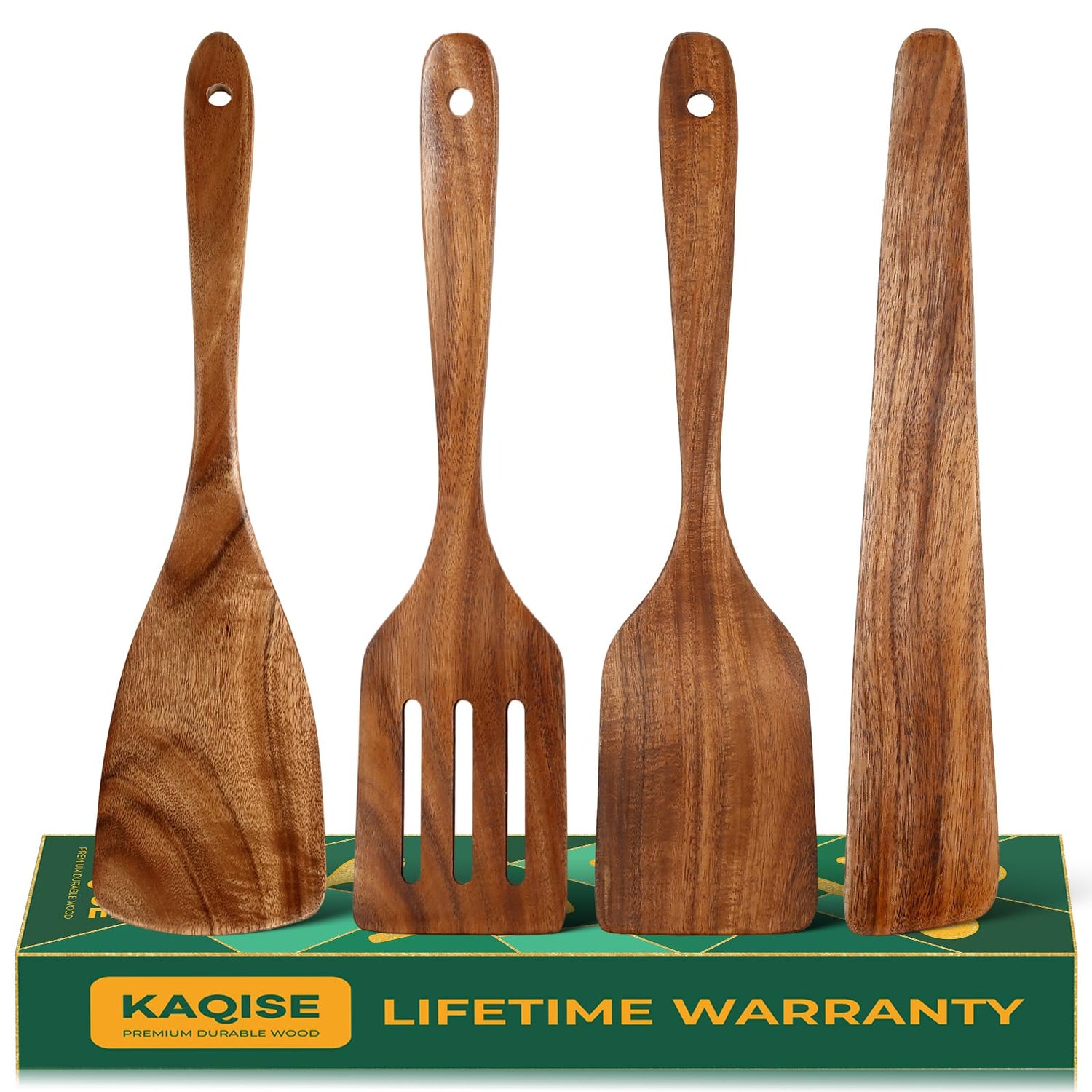 Wooden Spatula for Cooking, Natural Teak Wood Utensils including Frying Flat Spatula Turner, Wooden Kitchen Utensils Set (4Pcs)