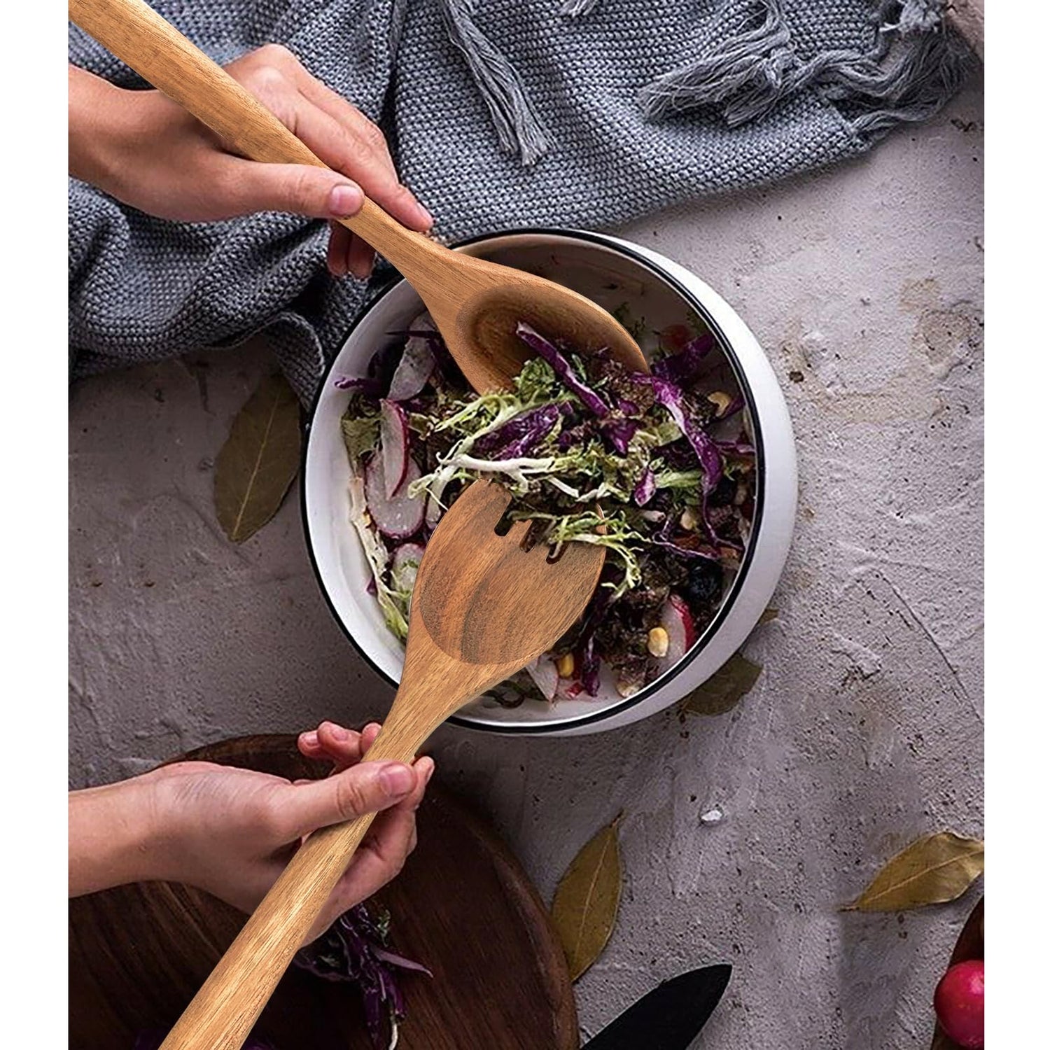 - 🍳 Stir, scoop, serve, scrape, flip and mix with our this complete set of 13pcs acacia wooden utensils, includes a 13" wok spatula, a 13" stir fry spatula, a 13" mixing spoon, a 13" salad fork spoon, a 12.4" soup ladle, a 11.3" skimmer, a 8.5" rice paddle spoon, and 6pcs measuring spoons for a well-outfitted workspace that's up to any cooking challenge.