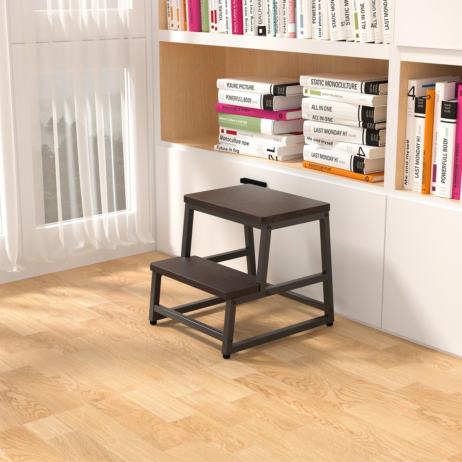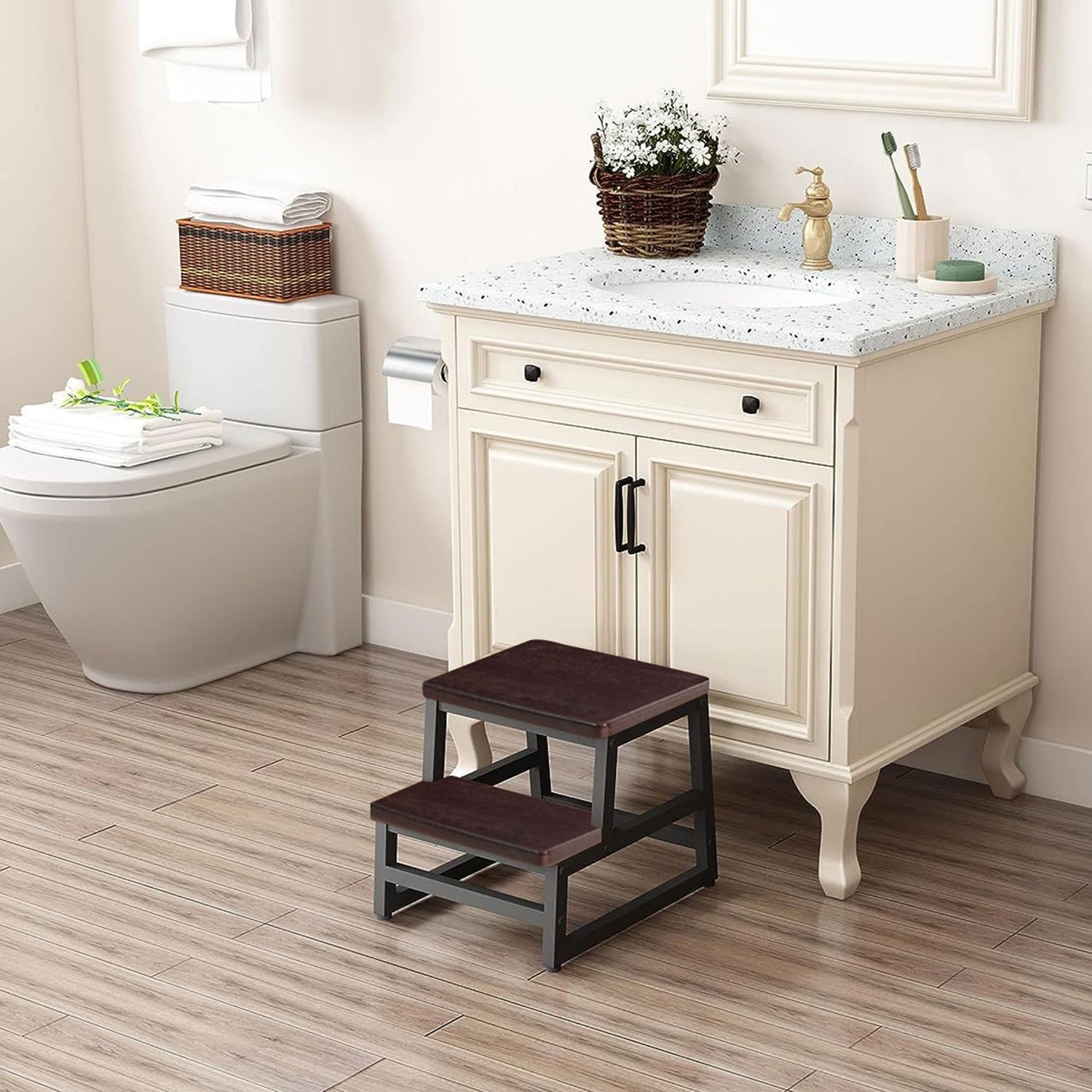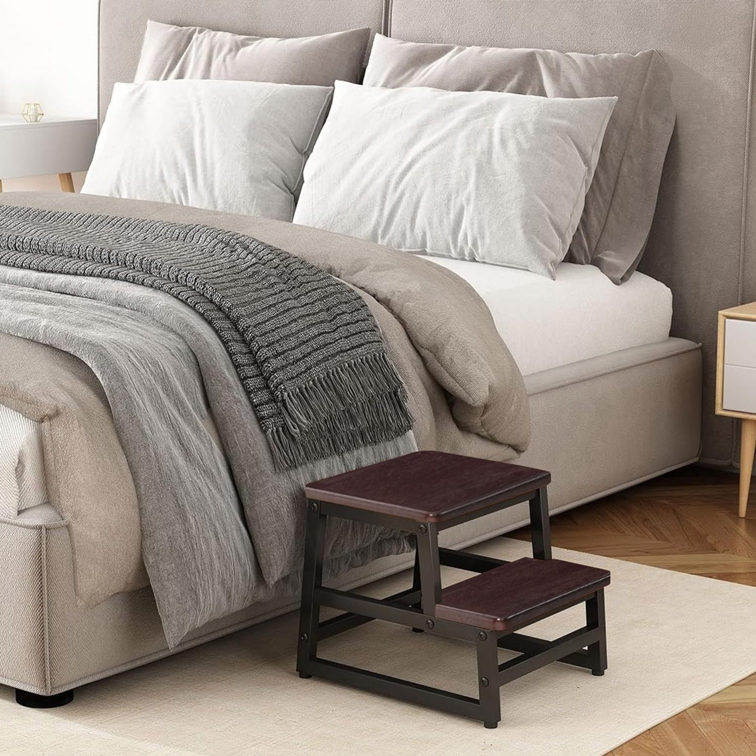Wooden Step Stool, Bed Steps for High Bed for Adults Kids, Heavy Duty Bed Step Stool for Adults with 500 LB Load Capacity, Wooden 2 Step Stool for Kitchen Bedroom Livingroom Bathroom(Dark Walnut)