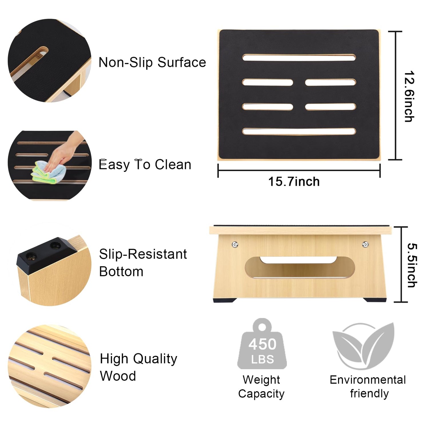 - 【Non-slip Tread Surface】 : Our wooden step stool has a larger surface of 15.75 inches x 12.60 inches. it is covered in a non-skid rubber to help reduce slips when stepping up or climbing down. besides, and there are anti-slip pads under the stool. which is vital for children and safety.Our platform step stool provides a 5.5 inch high support, acting as a step riser to help get onto higher steps. This stool with compact size is portable for carrying out and storing