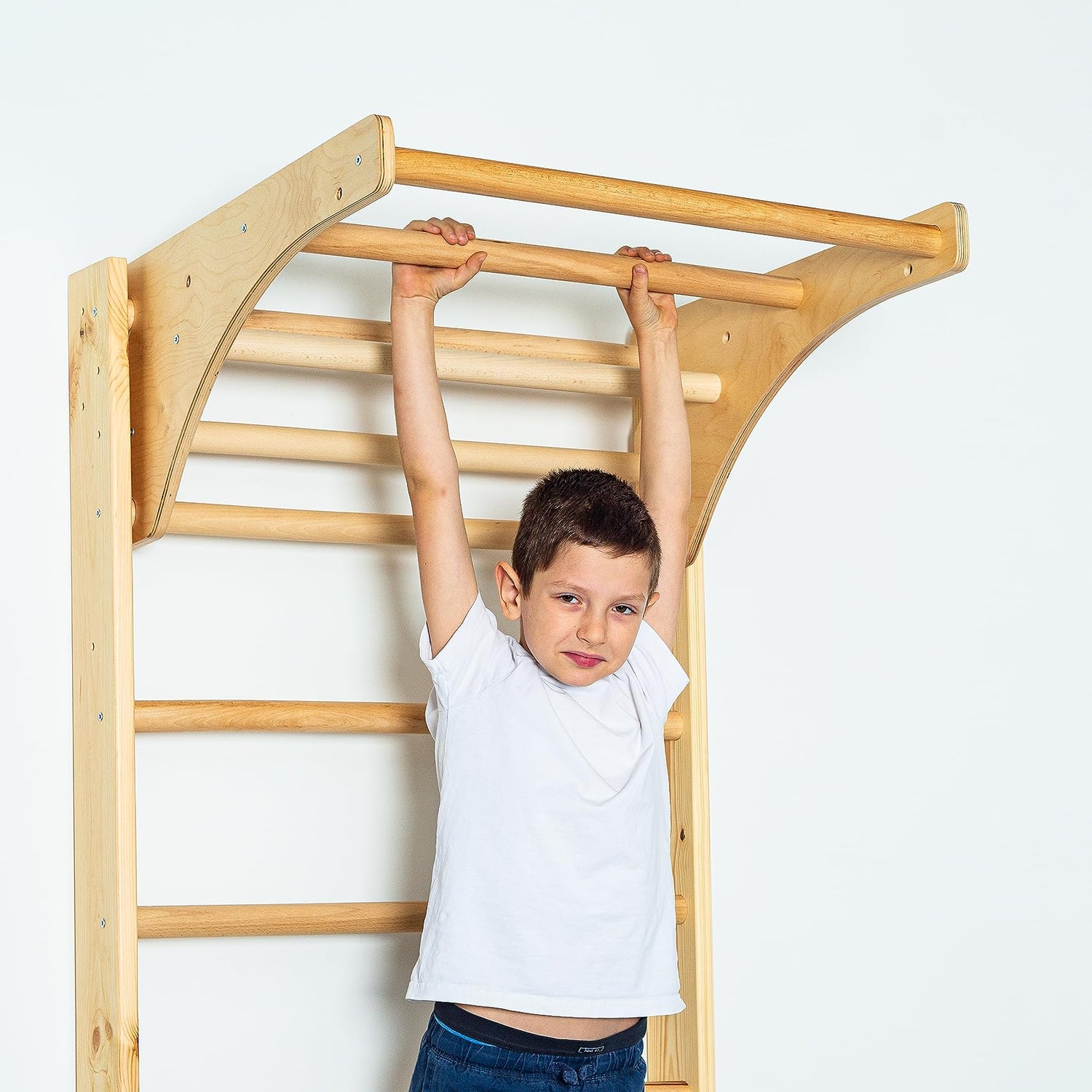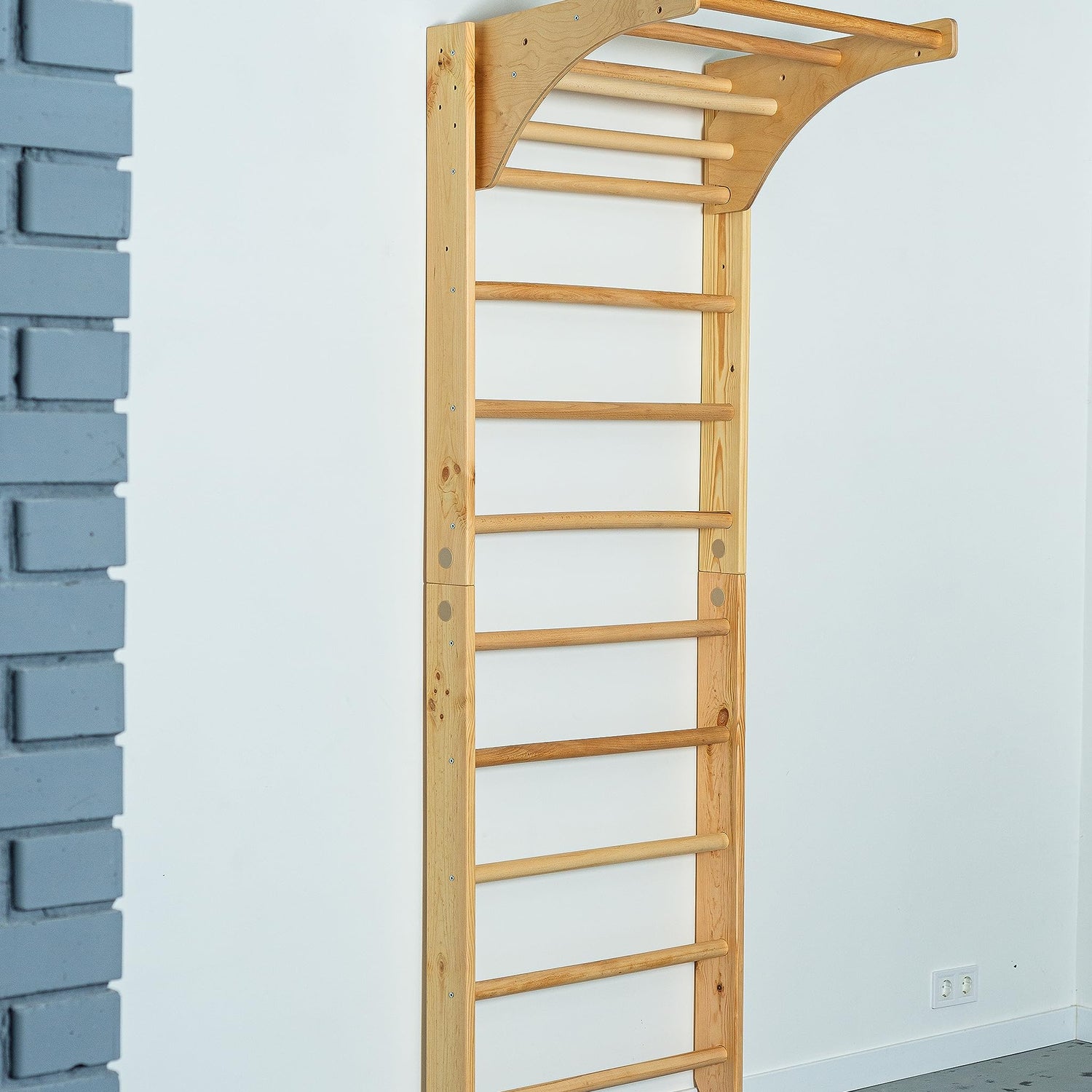 Details: Wall bars is the optimal Swedish Ladder for those ages 2 or older. This ladder may be used for gymnastics, strength training, fitness, parkour, bodybuilding, physical therapy, scoliosis treatment, and to improve range of motion by beginners and professionals alike. With its aesthetic craftsmanship and compact design, this ladder may be installed in homes, apartments, gyms, schools, clinics, and hospitals. The swedish ladder is also characterized by its reliability and ease of installation. In other words, this ladder is an all around pleasure to use! Furthermore, the 01-220 line uses a proven design that has undergone strict control, making it the safest option when it comes to Swedish Ladders. Made of natural hardwoods pine and beech, grown in ecologically clean areas. The finished product is coated with a certified varnish that is odorless and protects from moisture and wear, helping maintain an excellent appearance and adding to longevity.