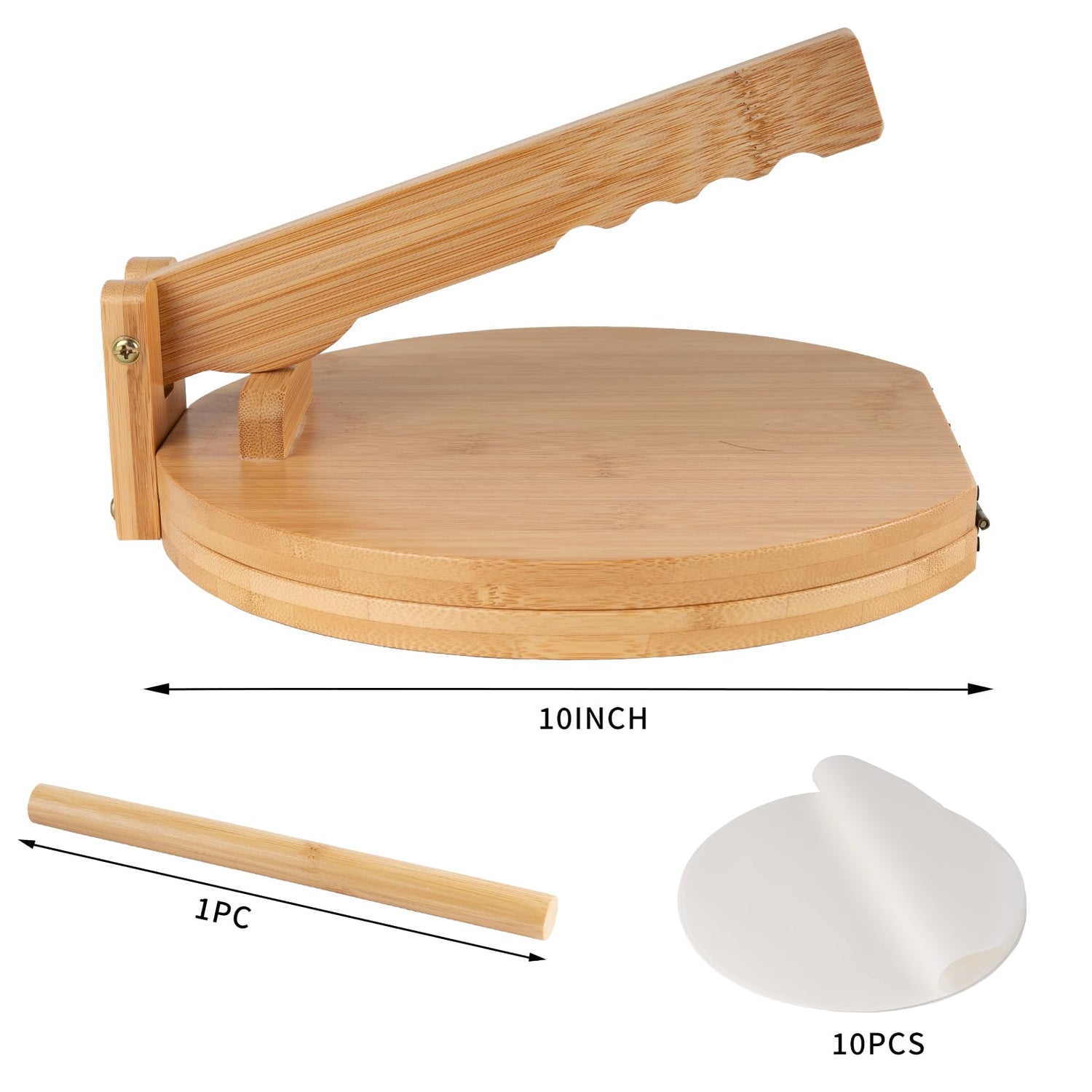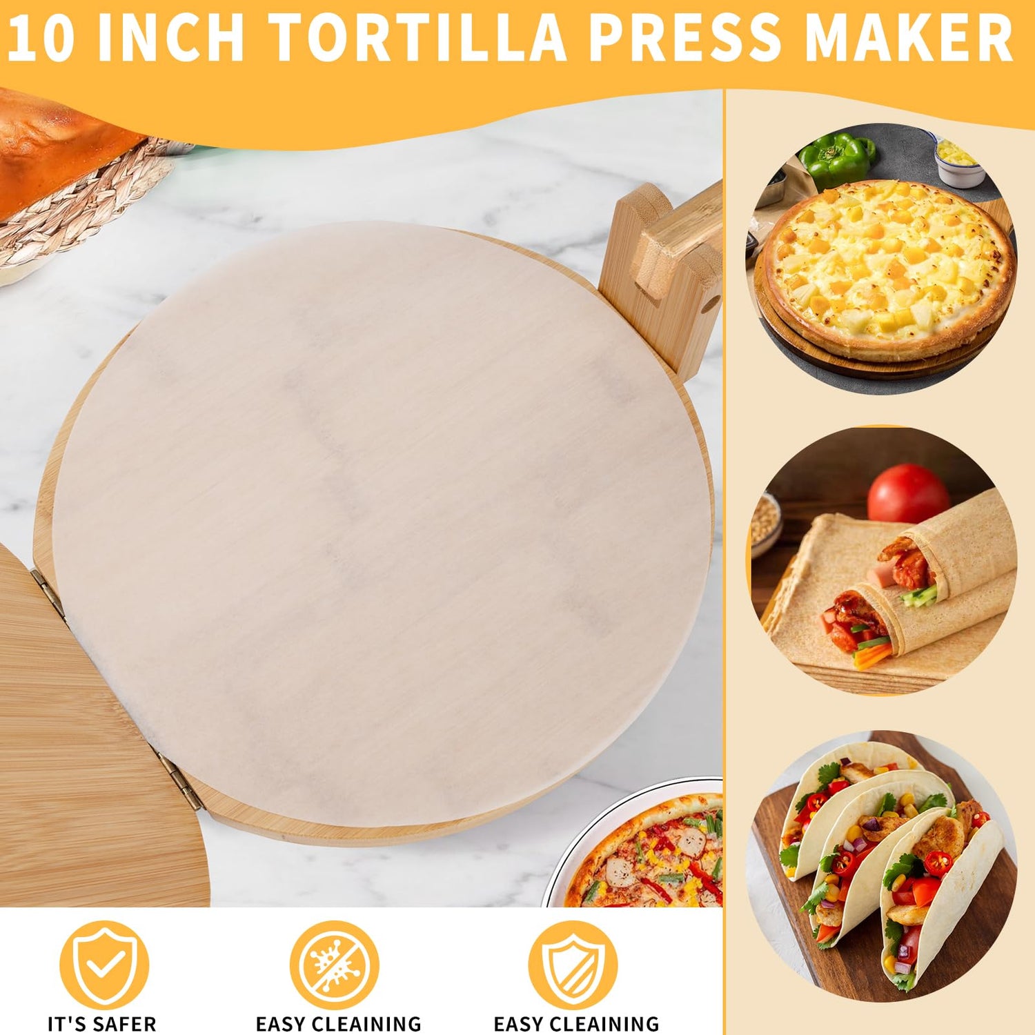 Wooden Tortilla Press 10 Inches with Rolling Pin & 50 Pcs Parchment Paper Mexican Tortillera Presser Homemade Tortillas Roti Pataconera Dough Press