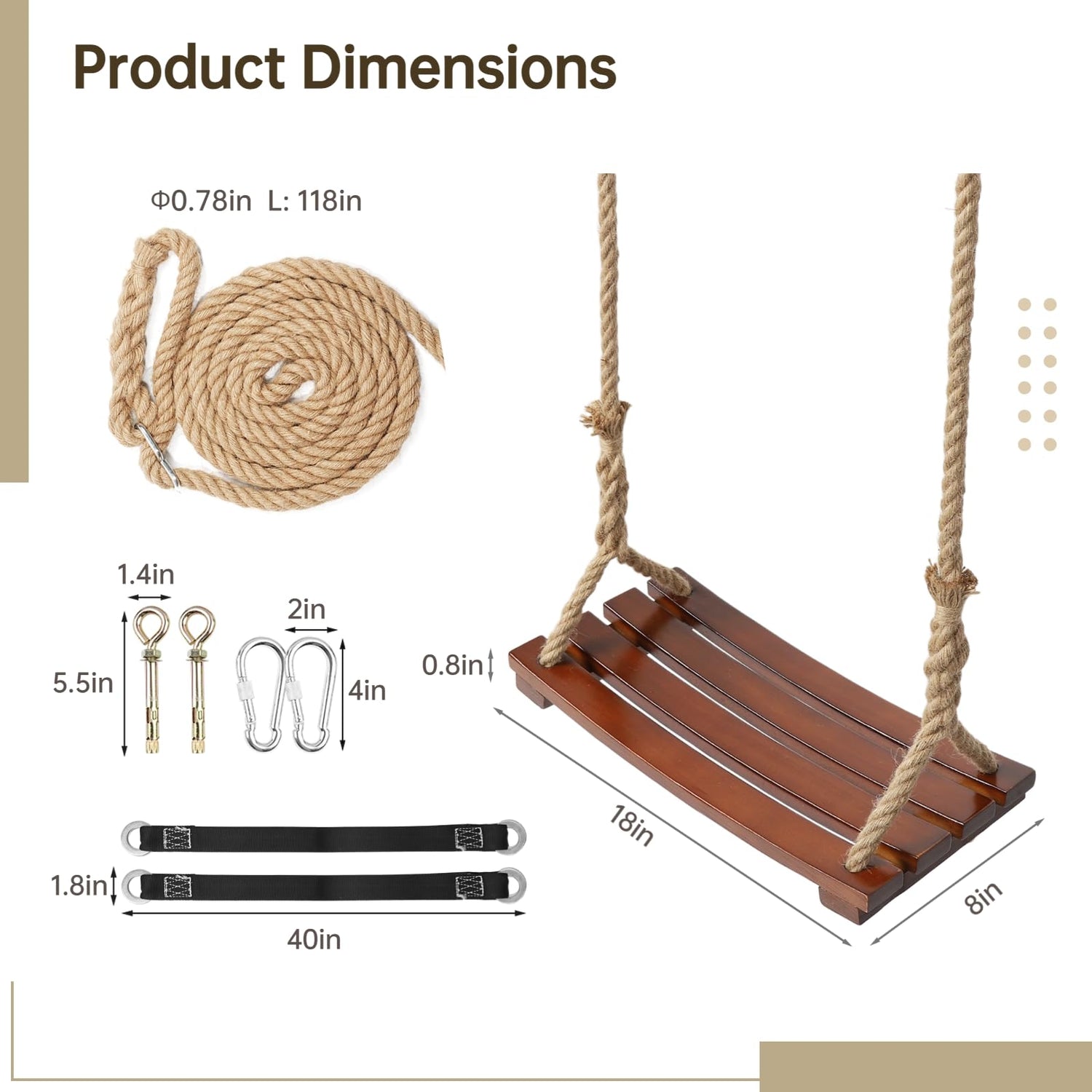 - High-quality Materials - The swing seat is made of solid natural elm wood with an anti-corrosion coating on the surface, which is heavy-duty, sturdy, and anti-break while giving you a comfy sitting experience. The rope is made of braided natural jute with a thickness of 0.78in, strong and hard to break. The buckles are made of premium metal, anti-rust, and can be used outdoors with confidence!