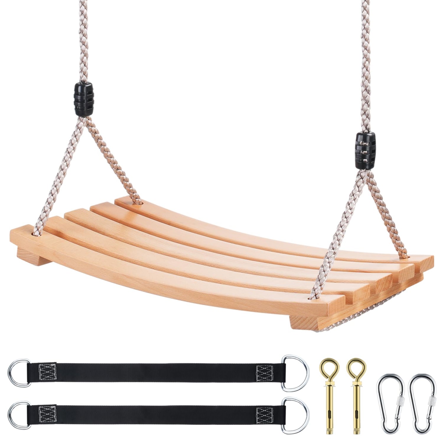 Wooden Tree Swing,Wooden Swing for Adults/Kids with 500lbs Load Capacity,Adjustable Hemp Rope Plus Tree Straps 100 inch, Hanging Wooden Swing for Indoor, Outdoor, Garden,Yard,Backyard (Curved Wooden)