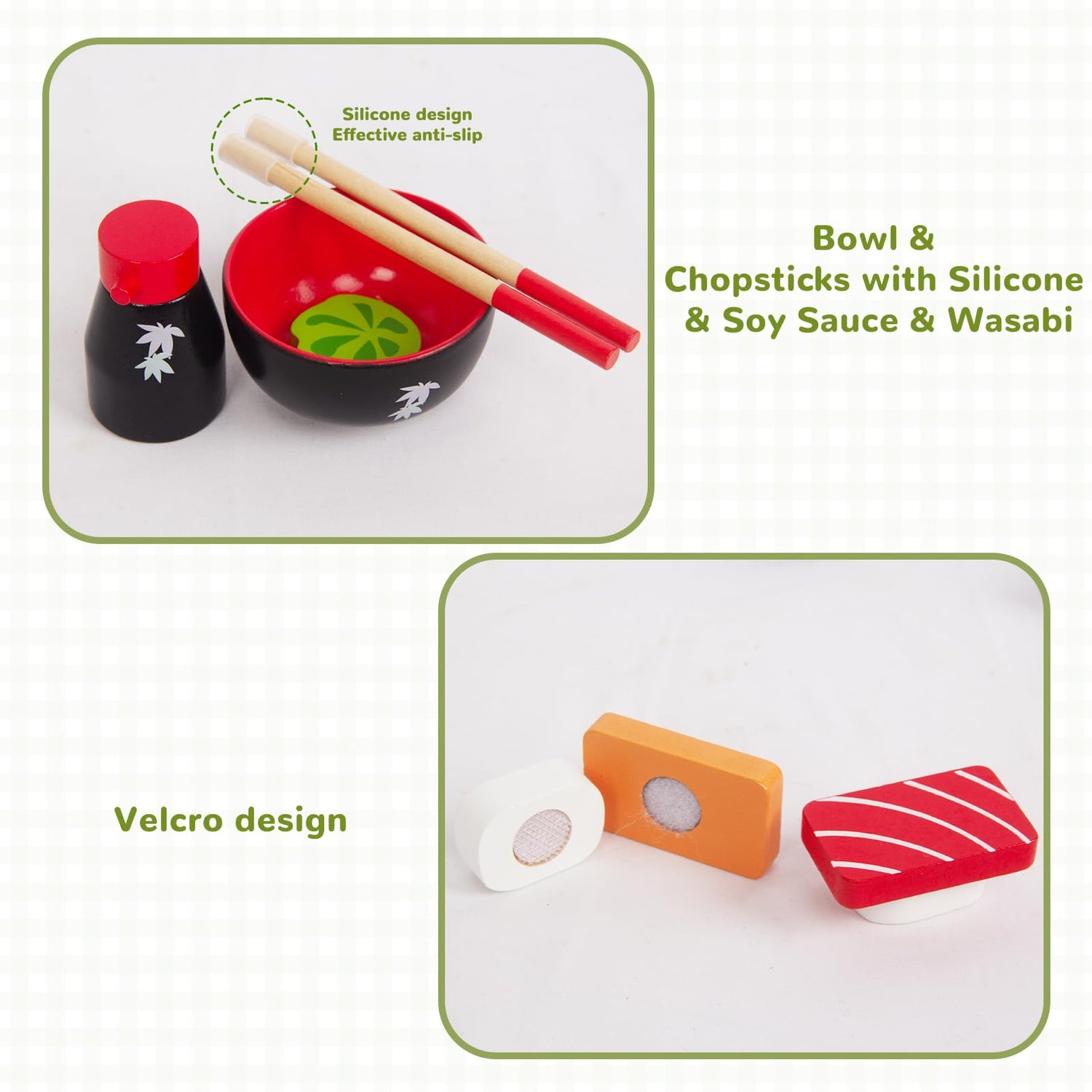 - ENTERTAINMENT: WoodenEdu sushi kitchen toy set comes with tray*1, chopsticks*1, bowls*1, soy sauce *1, mustard*1, sushi*4, and the sushi makes “slicing” noises when cut. The self stick tabs hold the pieces together. Great food play toys for 2-4 year old boys girls.