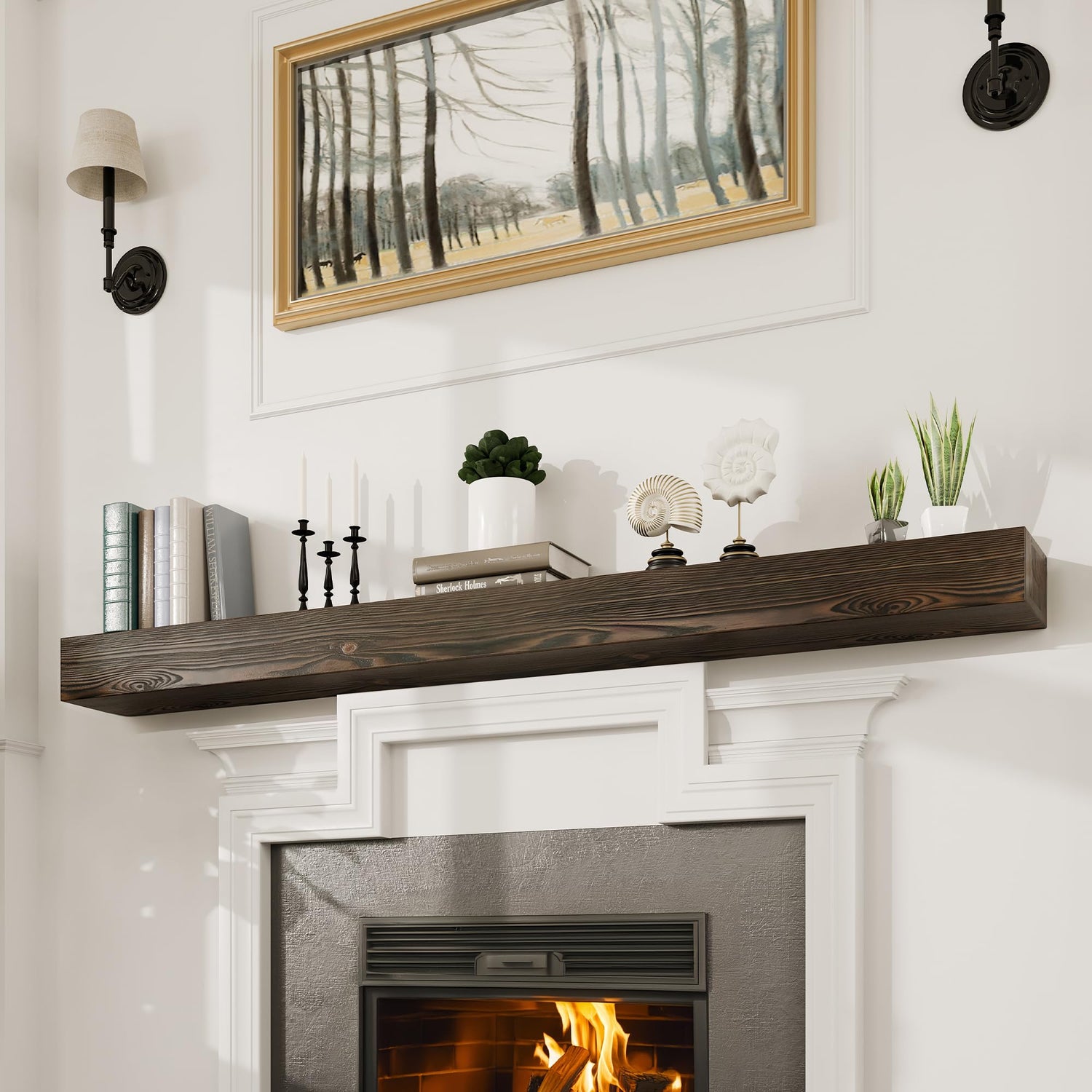 - Sophisticated Design — This weathered brown fireplace mantle shelf offers a chic storage solution, perfect for displaying family photos, trophies, and artwork and can be used as a TV mantel. The floating mantel shelf 72 inches can also serve as floating bookshelves above your fireplace and throughout your home.