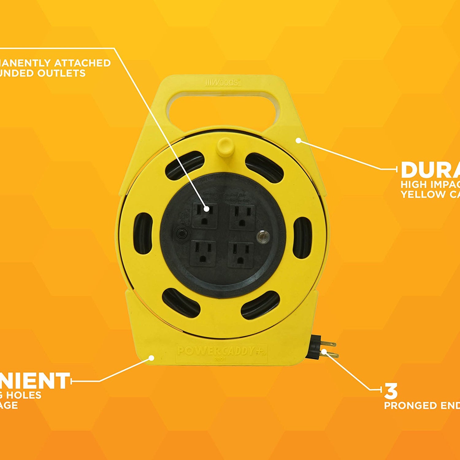 Woods 2801 Extension Cord Reel With Four 3-Prong Power Outlets (25 Foot; Orange) From the Manufacturer The Power Caddy Plus is the most simple and safe system for extension cord management. The unit has 4 outlets permanently attached to an extension cord built on a winding reel. Simply pull the cord out as far as you want; and when finished turn the wheel to wind it up. It has 4-handy outlets; a high impact case; and a circuit breaker with power indicator light. the cord is 25-feet of 16-gauge wire. it has 3 conductors. IT also has mounting holes on the bottom for wall mounting.