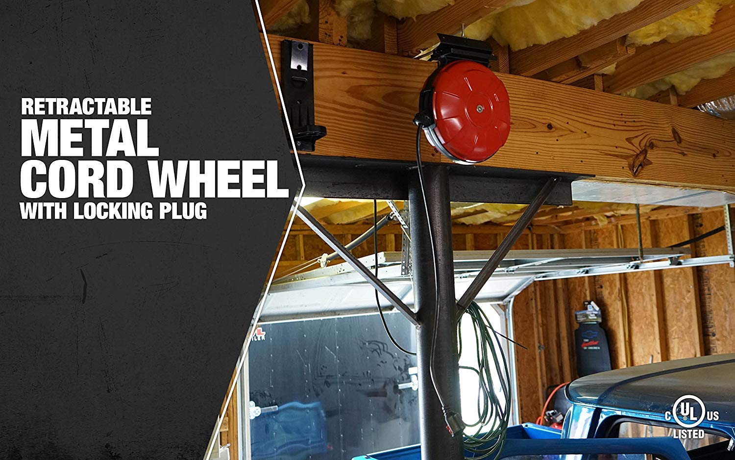Details: Woods 48004 14/3 SJTW Extension Cord Reel with Locking Plug, Red, 30-Foot. Mounting hardware included. Easy switchover of accessories. Housing made of heavy duty steel. Industry approvals: UL Listed, cUL Listed. Intended for anywhere you need extra light or power. The Woods (R) brand is a registered trademark of Coleman Cable Inc.