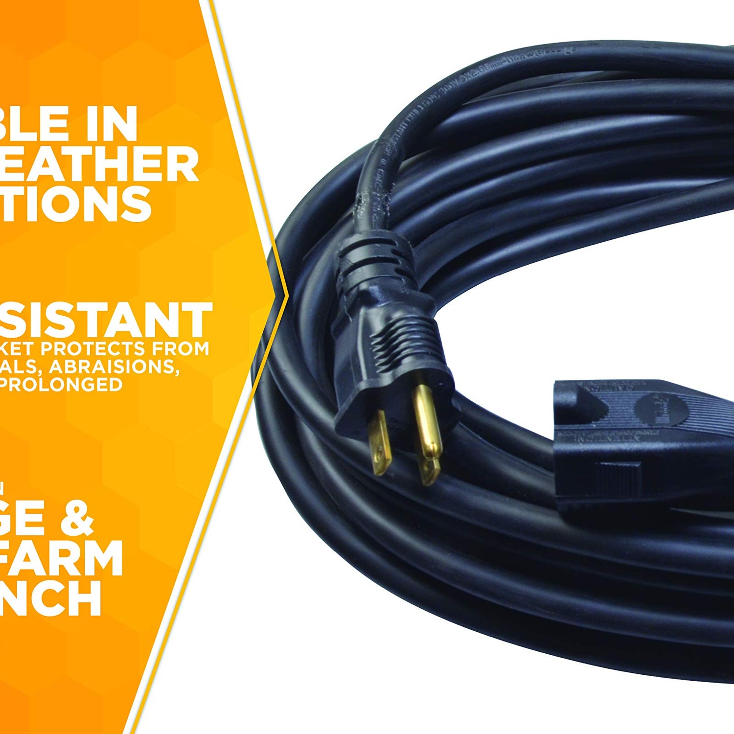 - FLEXIBLE; ALL-WEATHER EXTENSION CORD remains flexible and tangle-free under all weather conditions and wouldn’t become stiff or crack in cold weather
