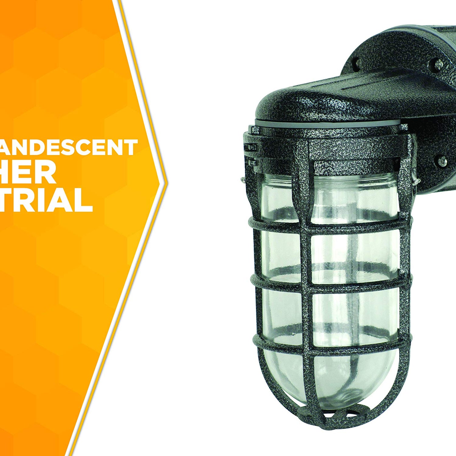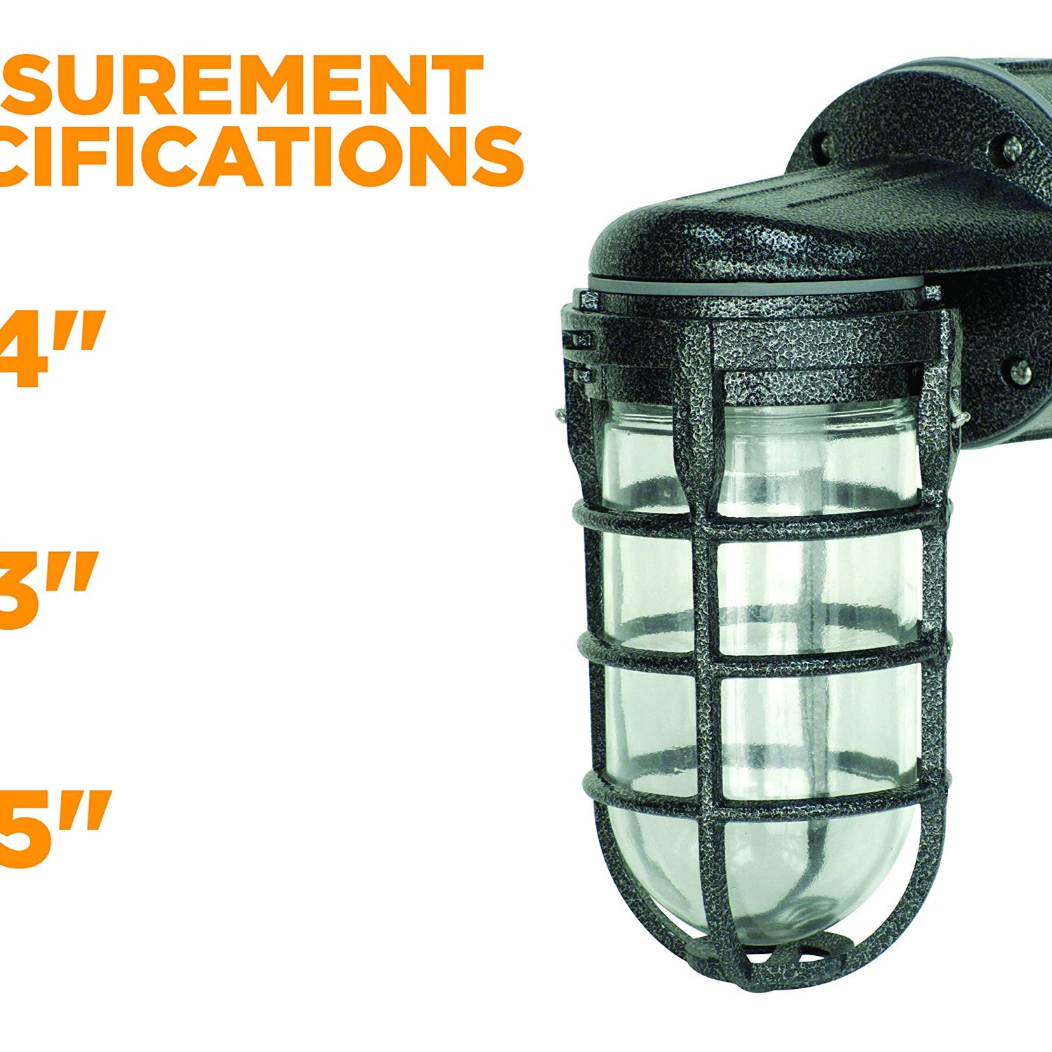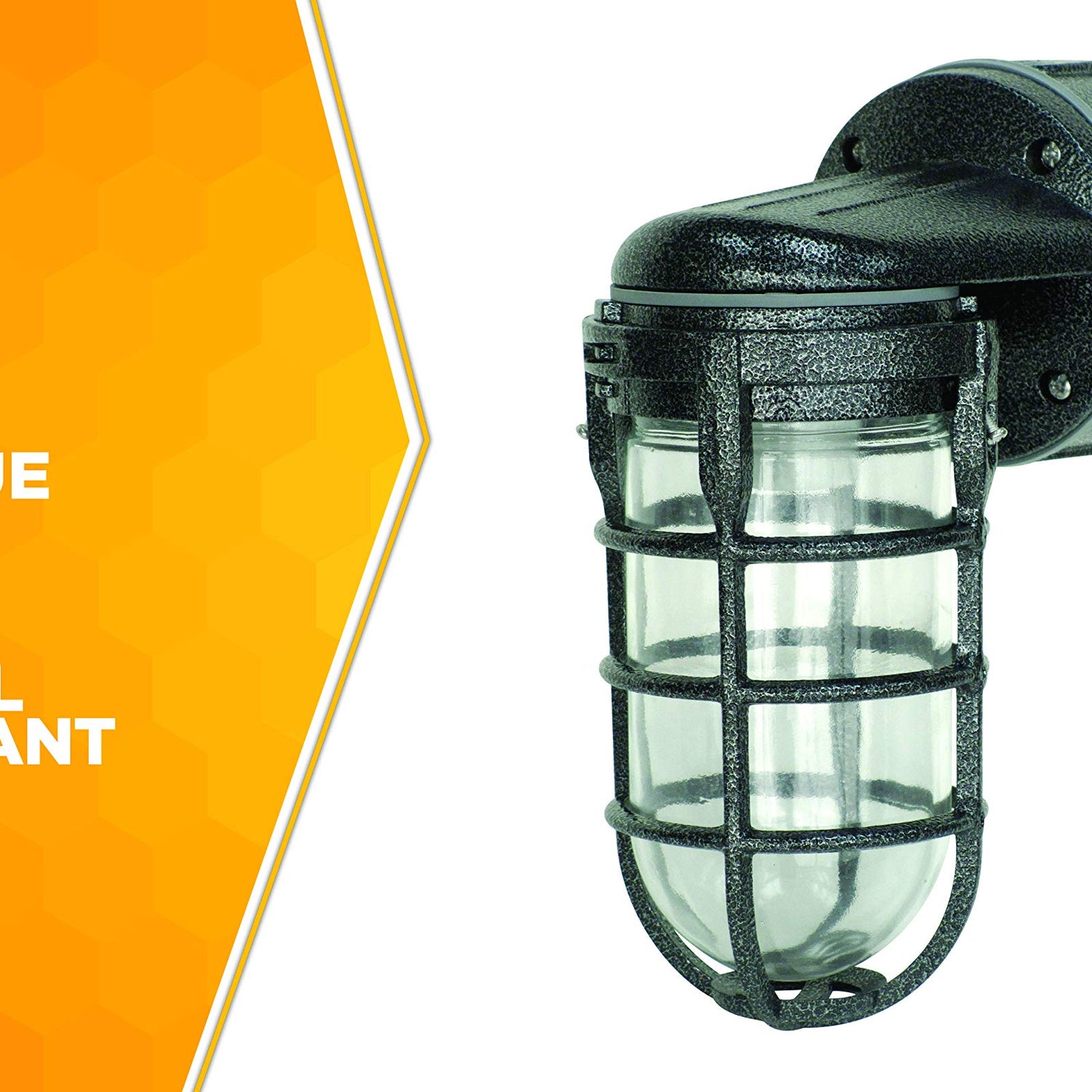 - UL AND CL LISTED: this product tops in quality and performance as it has obtained an UL and CL listing and come with a 90 day warrantyThe light has 1/2-inch ips thread access on its top and sides and includes the mounting boxThis versatile; easy to install attractive hammered black 150-watt wall mount incandescent light provides contemporary looking lighting and security to any business or homeThis woods wall mount lighting will be a durable and impact-resistant light wherever you place it without the need for batteries