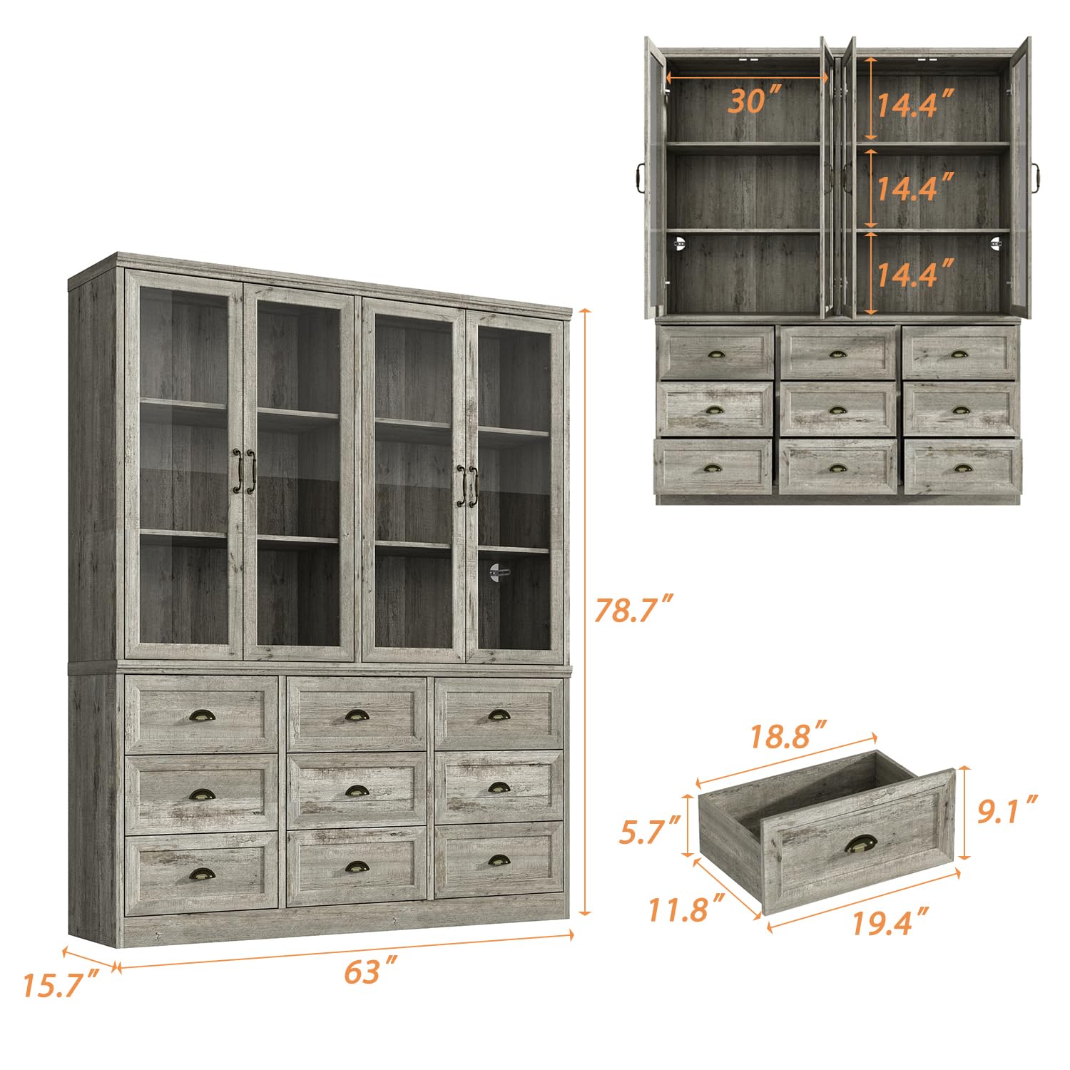 - [Storage & Display] - This WOODTIME tall display cabinet features 6 shelves and 9 drawers. The shelves and glass doors display your collections, books, wine, etc. and keep out the dust. The drawers can organize clutter to keep your space clean and organized. Display cabinet dimensions: 15.7"D x 63"W x 78.7"H. Drawer inner dimensions: 11.8"D x 18.8"W x 5.7"H