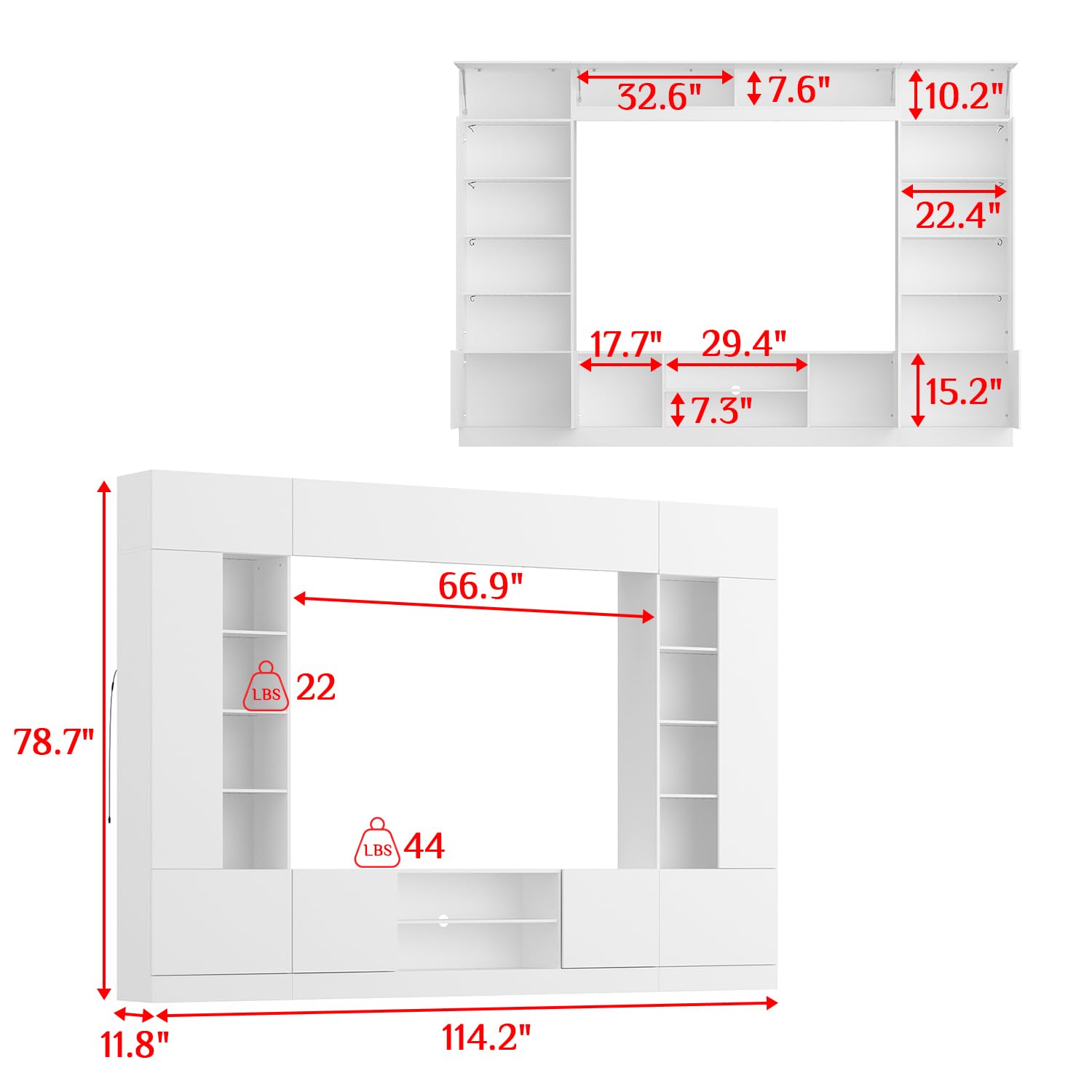 - [Package Contents & Dimensions] - Overall sizes: 114"W x 11.8"D x 78.7"H, sizes of the TV console: 66.6"W x 11.8"D x 19.5"H, wall mounted top shelf: 66.6"W x 11.8"D x 11.7"H, tall bookshelf: 23.5"W x 11.8"D x 78.7"H. This wall unit will come in 2 boxes and may not arrive at the same time, the hardware and the manual are in one of the boxes