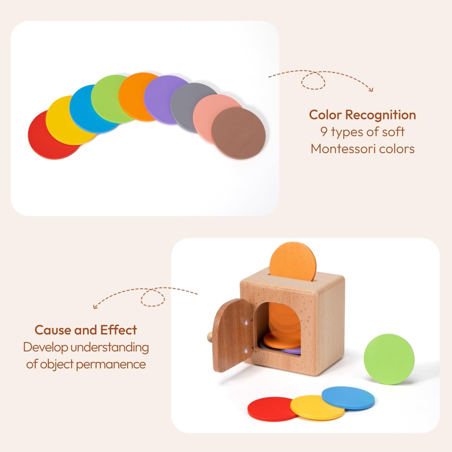 - Montessori Toys for Babies 18+ Months: This wooden Montessori toy set includes a small wooden box and 9 wooden coins of different colors. Unlike the coin box with drawer openings on the market, this Montessori coin box features a small door on the front. Children can open the door and use their fingers to retrieve the coins, thereby exercising their fine motor skills. Babies will enjoy dropping the colorful coins into the box from the top and then opening the door to take them out