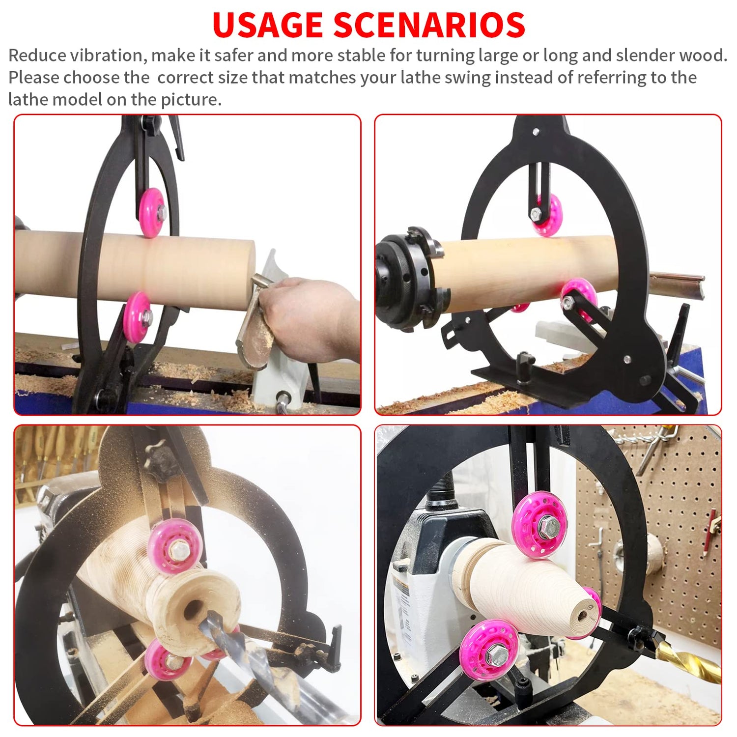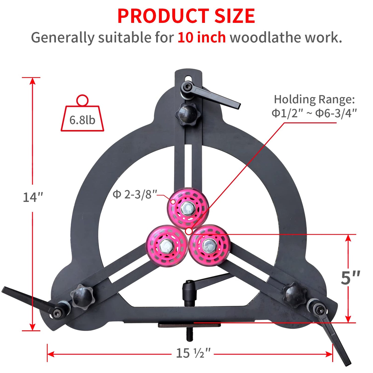 Details: Compatible with 10" swing lathe.Lathe steady rest is great for eliminating the vibration and wobbly while turning long and slender pieces. The base of this steady rest has adjustable spacer blocks providing a secure fit on lathe beds. The non-marring wheels has a wide range to move so it can be used as a bowl rest as well as a steady rest.