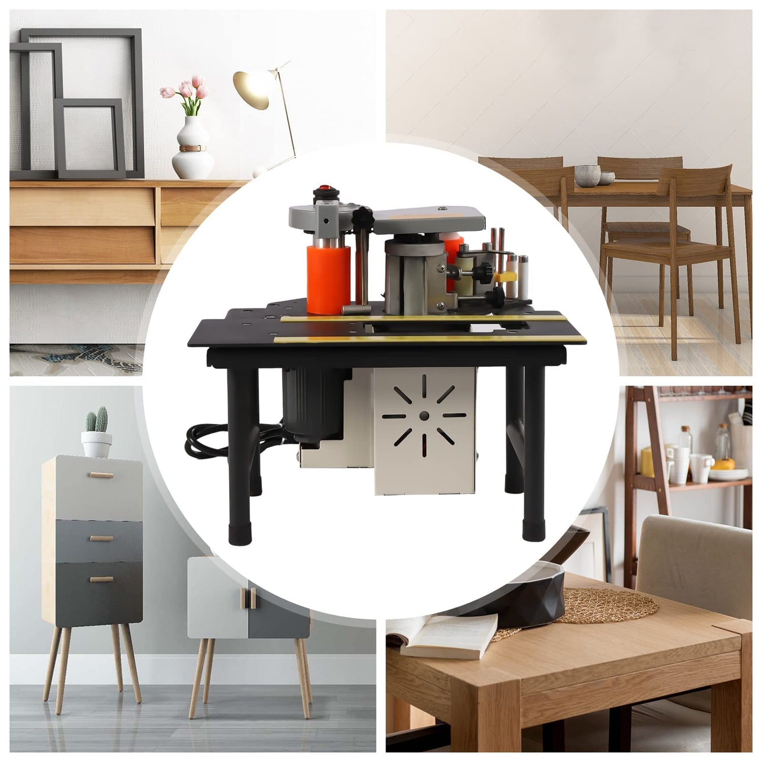 - ADAPTABLE: The woodworking edge banding machine adopts a multi-functional design, which is suitable for edge banding in different shapes, for example, straight edge, arc edge, curve, outer arc, inner arc and circumference. Suitable for various materials such as melamine paper tape, wooden tape, and plastic (PVC or ABS) self-adhesive edge banding.