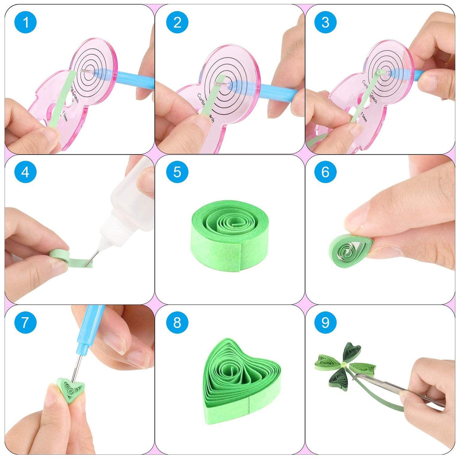 - Package includes: 30 x quilling art paper pattern template, 9 x quilling paper (about 2340 strips), 1 x quilling pen, 1 x awl, 1 x scissors, 1 x glue bottle (no glue), 3 x pearl pins, 1 x tweezers, 1 x ruler.