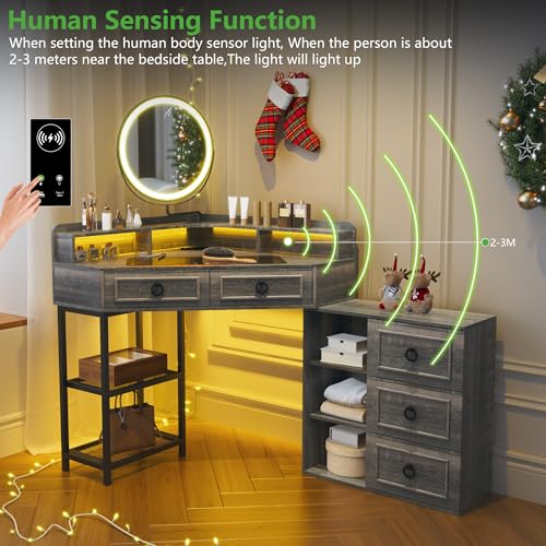 - ✅ 【Vanity with Lights】 Corner vanitys Color: White/Rustic Brown. Adjustable automatic LED light: Cold white/Warm White/Warm Yellow