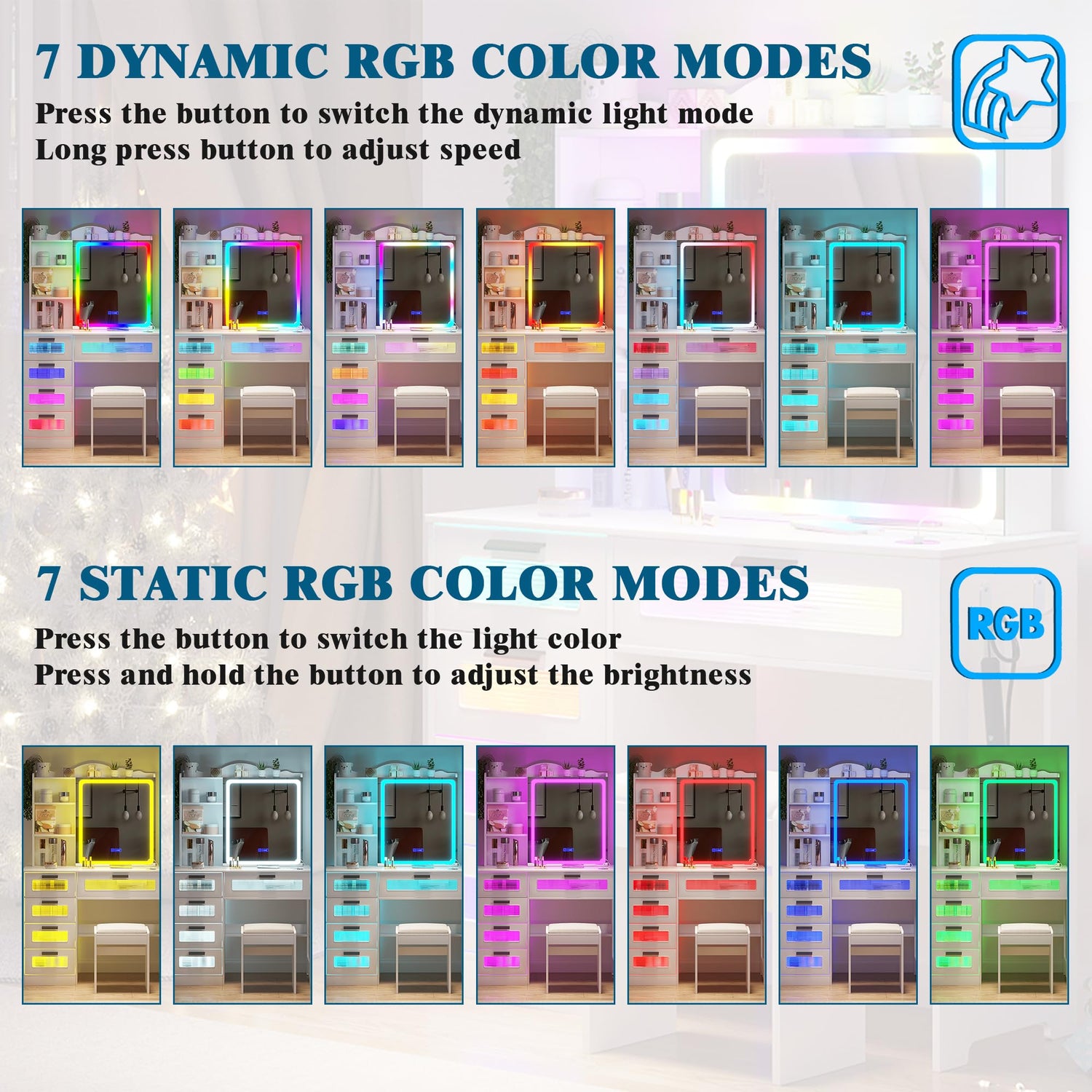 - ✅【Dancing RGB lights】The modern vanity has 7 kinds of dynamic and static lights. In the dynamic mode, short press can change the light color, and long press can adjust the speed. In static mode, short press can switch the light color, and long press can adjust the speed. In addition, we are also equipped with a remote control to allow you to change the light color you want at any time