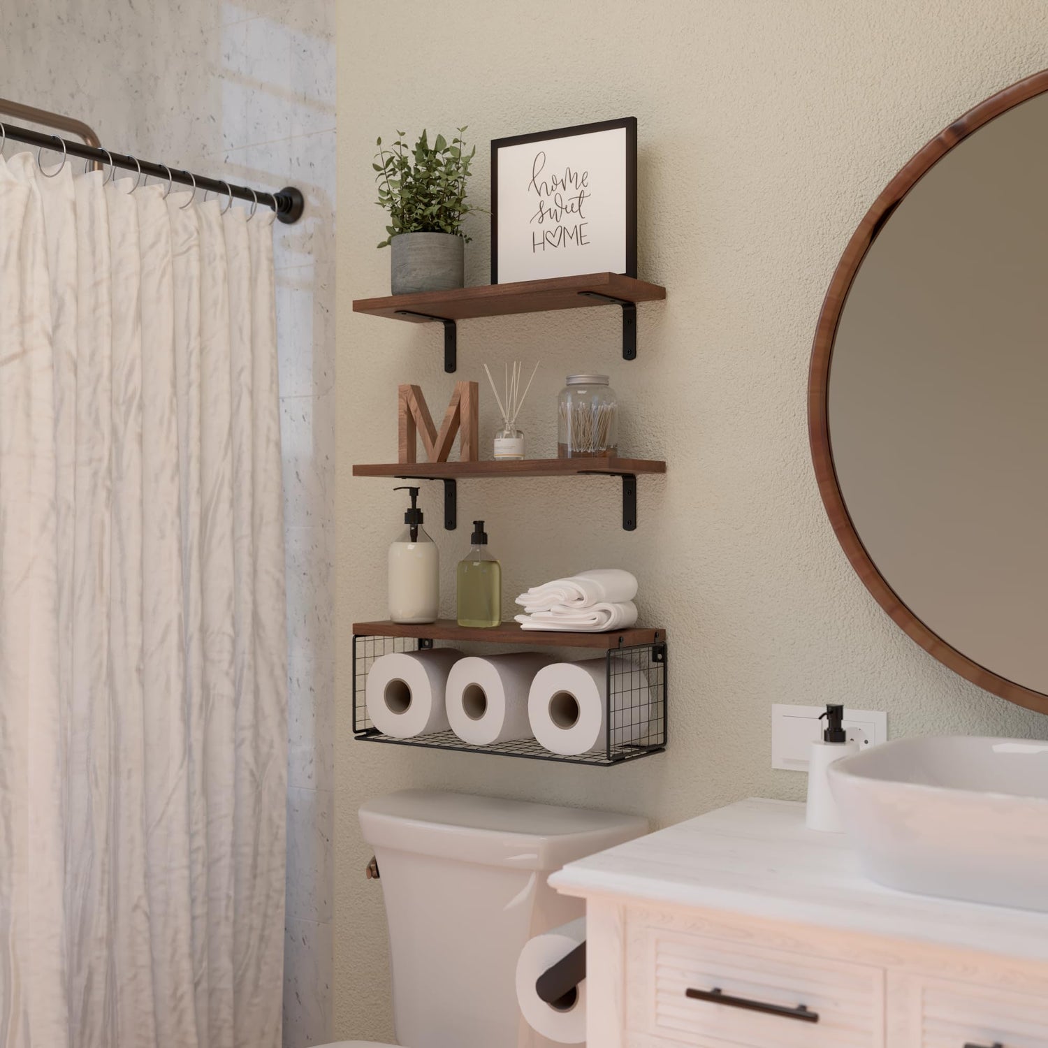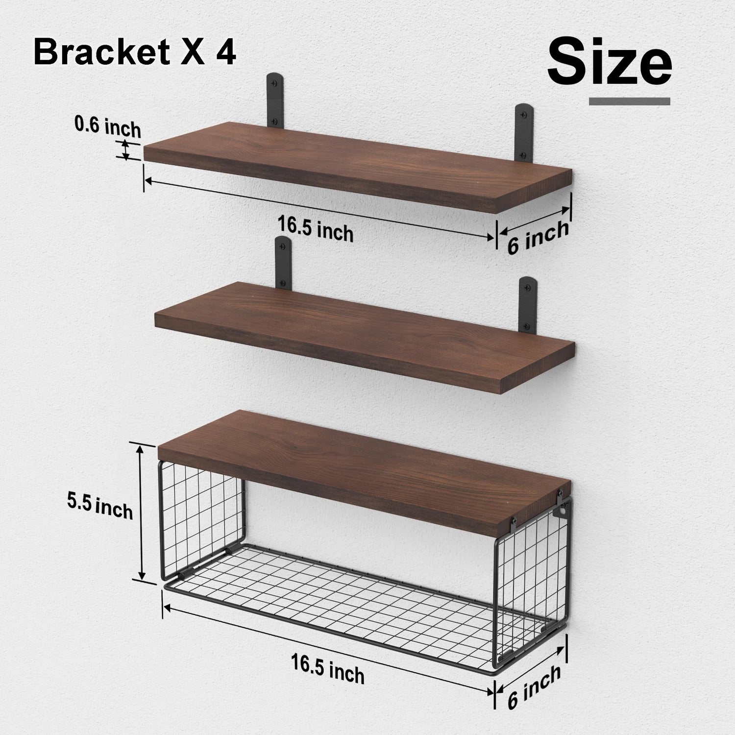 - 2-in-1 Floating Shelves with Toilet Paper Basket - The size of the floating shelves basket is 16.5*6*5.5 inches, which can store 3 rolls of toilet paper, other small objects, and towels. Our storage basket of bathroom floating shelves is made of iron wire with a powder-coated finish, which is more solid and won’t rust. It fits the humid environment. These wall-mounted floating shelves with a grid design will reduce dust accumulation, and keeps the toilet paper clean and dry.
